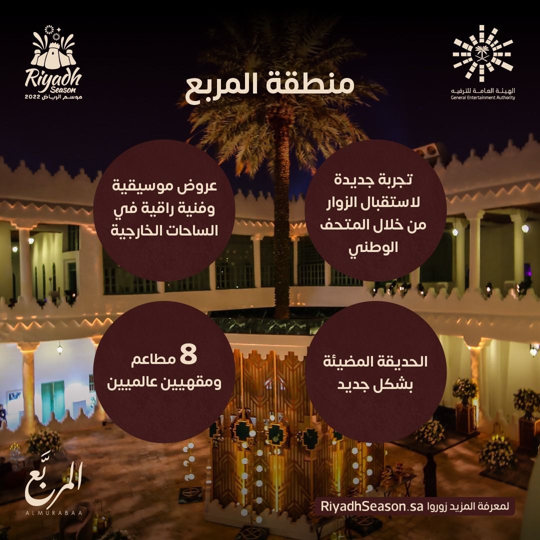 وبين آل الشيخ أن موسم هذا العام سيعيش فيه الزوار تجربة جديدة في منطقة "المربع"، حيث يتم استقبالهم من خلال المتحف الوطني، مشيرا إلى أن المنطقة ستشهد عروضا موسيقية وفنية راقية بساحاتها الخارجية، إضافة إلى 8 مطاعم، واثنين من المقاهي العالمية، فضلا عن إضاءة الحديقة بشكل جديد يتناسب مع موسم الرياض الذي يحتوي على تفاصيل فوق الخيال.