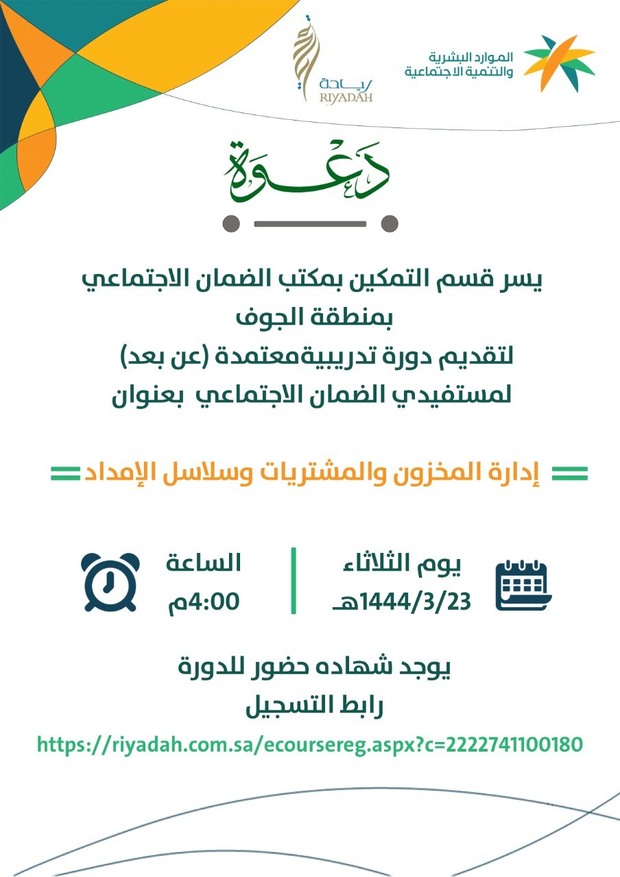 نظم مكتب الضمان الاجتماعي المكتب الرئيسي بمنطقة الجوف ممثلا بقسم التمكين الثلاثاء الموافق ١٤٤٤/٣/٢٣ هـ دورة تدريبيه لمستفيديه بالتعاون مع معهد رياده بالجوف بعنوان (ادارة المخزون والمشتريات وسلاسل الامداد) عقدت عن طريق برنامج زوم والتي استفاد منها عدد من مستفيدي الضمان مع منحهم شهادة بالدوره .