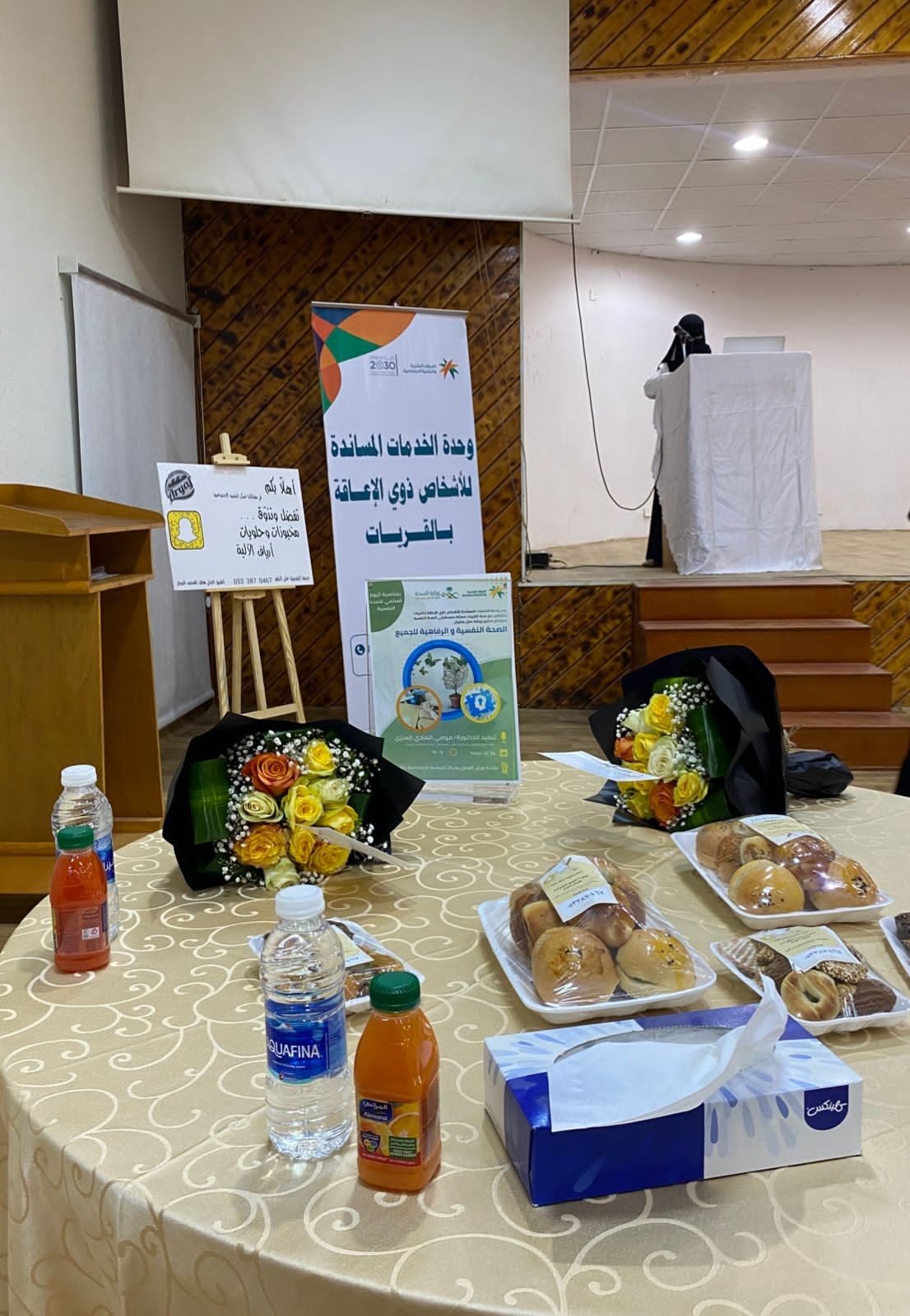 تفعيلاً لليوم العالمي للصحة النفسية تحت شعار(الصحة النفسية والرفاهية أولوية للجميع) اقامت وحدة الخدمات المساندة للاشخاص ذوي الاعاقة بالقريات صباح يوم الخميس ١٤٤٤/٣/٢٤هـ ورشة عمل بعنوان (الصحة النفسية والرفاهية للجميع) بالتعاون مع صحة القريات ممثلة بمجمع إرادة للصحة النفسية، القتها الدكتورة/موضي الهادي العنزي نائب الطب النفسي والمدير الطبي لمجمع إرادة للصحة النفسية.