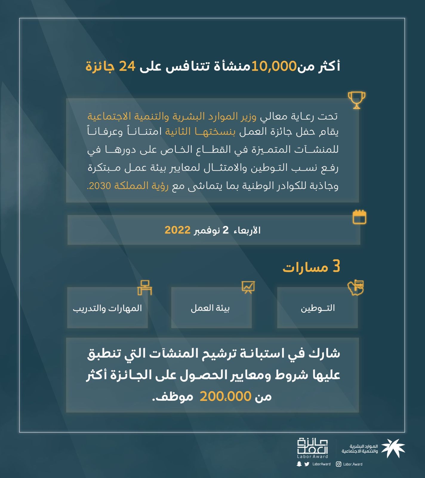 وزير الموارد البشرية والتنمية الاجتماعية يرعى حفل "جائزة العمل" 2022 .. الأربعاء القادم