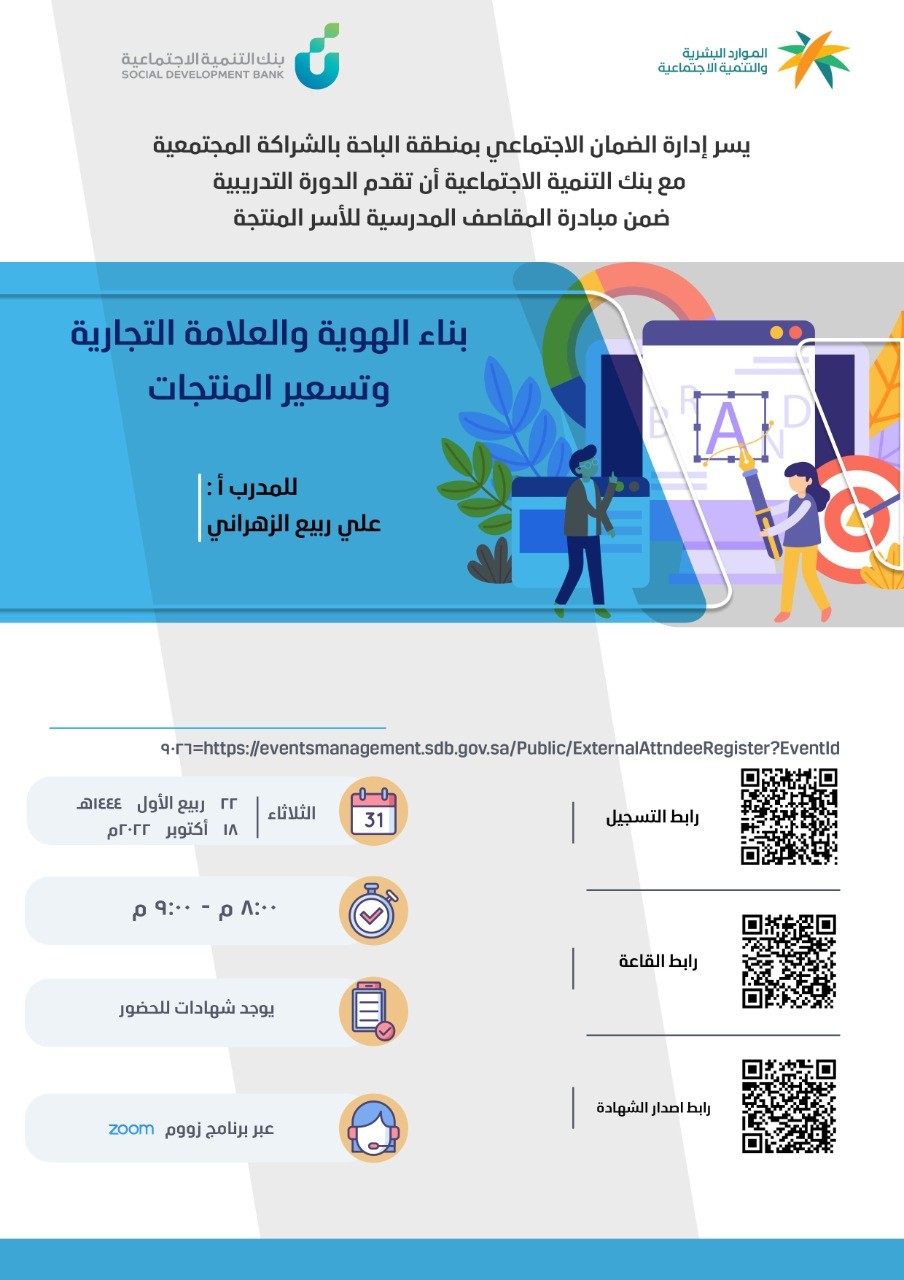 قدم مكتب الضمان الاجتماعي بمحافظة بلجرشي والتابع لفرع وزارة الموارد البشرية والتنمية الاجتماعية بمنطقة الباحة وبالشراكة مع معهد رؤية المستقبل وجمعية البر الخيرية ببلجرشي دورتين بعنوان (اساسيات صيانة الجوالات، دورة فن التجميل) ودورة أخرى بالشراكة المجتمعية مع بنك التنمية الاجتماعي بعنوان (بناء الهوية والعلامة التجارية وتسعير المنتجات) ضمن مبادرة تشغيل المقاصف المدرسية