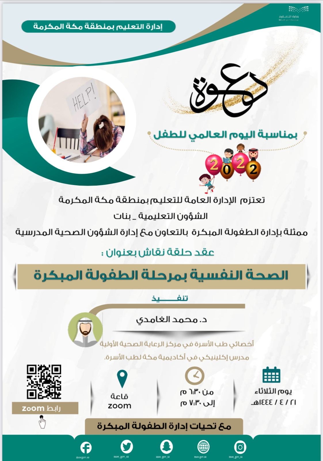 كما ستُعقد يوم الثلاثاء عبر برنامج الزوم خلال الفترة المسائية من الساعة السادسة والنصف إلى الساعة السابعة والنصف حلقة نقاش بعنوان (الصحة النفسية بمرحلة الطفولة المبكرة) بالتعاون مع إدارة الشؤون الصحية المدرسية بتعليم مكة والتي سيقوم على إلقائها للمهتمين بالطفل د. محمد الغامدي أخصائي طب الأسرة في مركز الرعاية الصحية الأولية والمدرس الإكلينيكي في أكاديمية مكة لطب الأسرة .