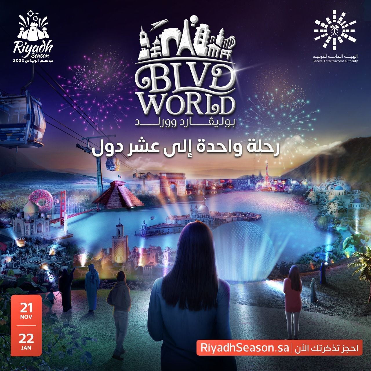 تستعد منطقة بوليفارد وورلد، إحدى مناطق موسم الرياض الترفيهية2022 ، لاستقبال الزوار غدًا بخيارات ترفيهية مميزة، ومنها التلفريك الذي سيحلق بالزوار فوق سماء معالم شهيرة من مختلف أنحاء العالم داخل العاصمة الرياض، ومنها: قوس النصر من العاصمة الفرنسية باريس، إضافةً إلى هرم "تشيتشن إيتزا"، أحد أكبر معالم حضارة المايا في المكسيك، وعدد من المعالم التي تعود إلى حضارات متعددة في الصين وإيطاليا والمغرب والهند وإسبانيا وأمريكا واليابان واليونان.