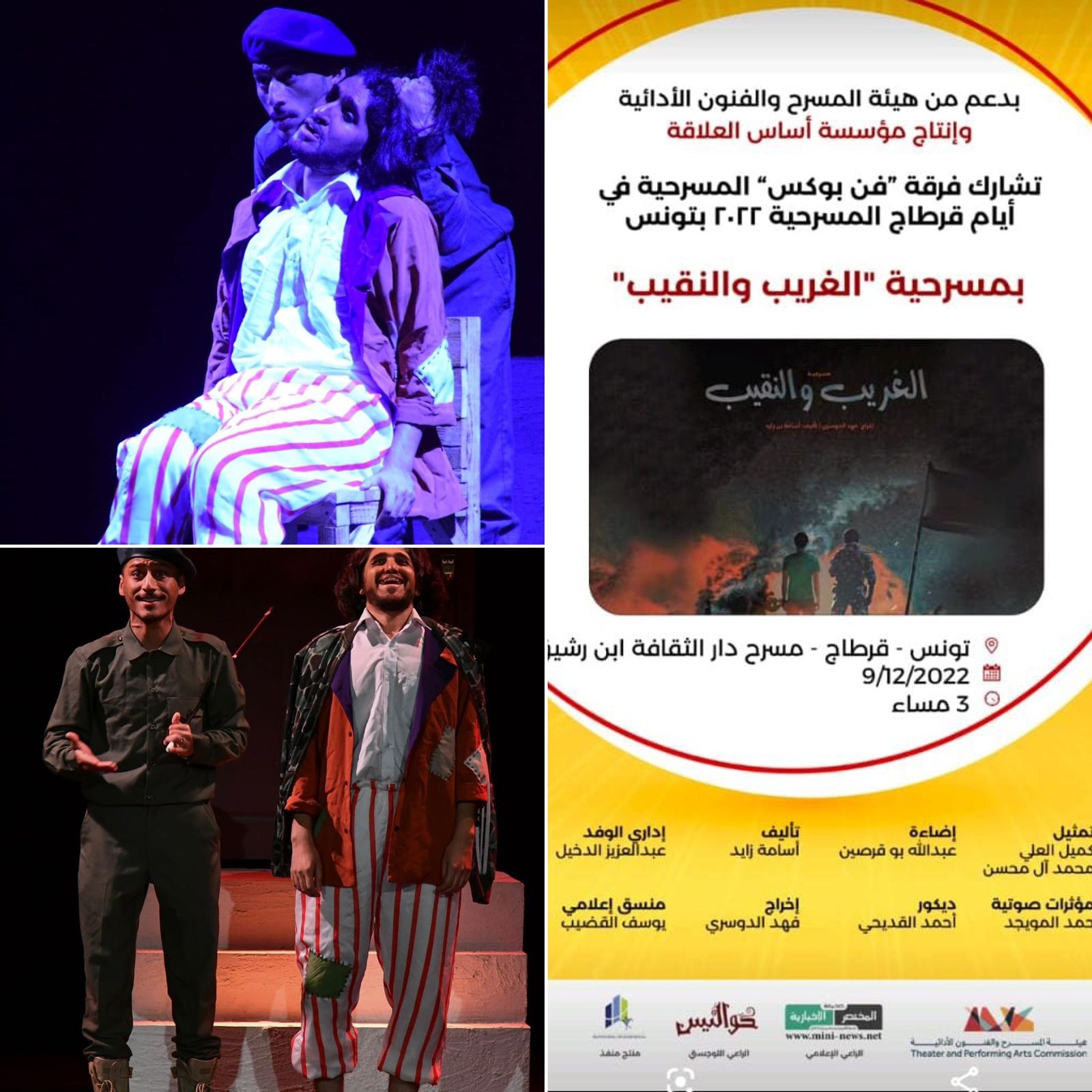 على مسرح ابن رشيق في تونس المسرحية السعودية "الغريب والنقيب" التي تشارك بها مؤسسة أساس العلاقة ممثلا بفرقة "فن بوكس " المسرحية .