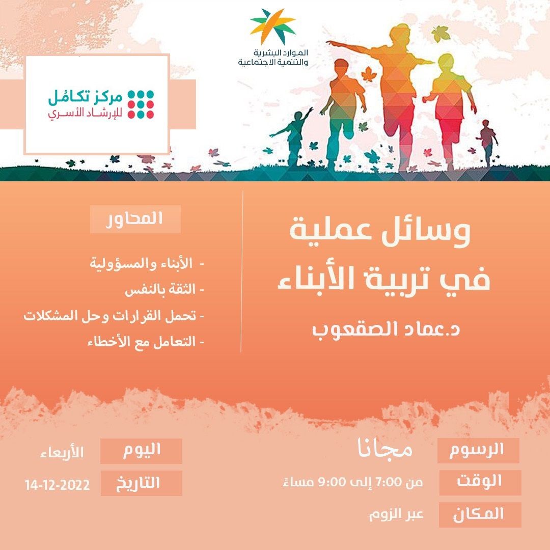 بالتعاون مع إدارة الأسر الكافلة بفرع وزارة الموارد البشرية والتنمية الاجتماعية في المنطقة الشرقية ينظم مركز تكافل للإرشاد الأسري دورة بعنوان ( وسائل عملية في تربية الأبناء ) يقدمها الدكتور / عماد الصقعوب ، وذلك يوم الأربعاء ٢٠ جمادى الأول ١٤٤٤ الموافق ١٤ ديسمبر ٢٠٢٢م من الساعة السابعة حتى التاسعة مساء عبر برنامج الزوم .