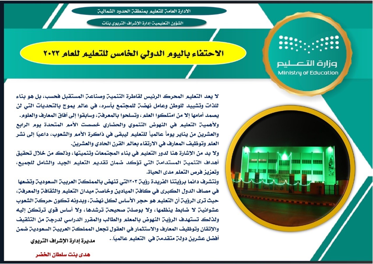 كلمة مدير إدارة الإشراف بمنطقة الحدود الشمالية (بنات) هدى الخضر بمناسبة اليوم الدولي للتعليم