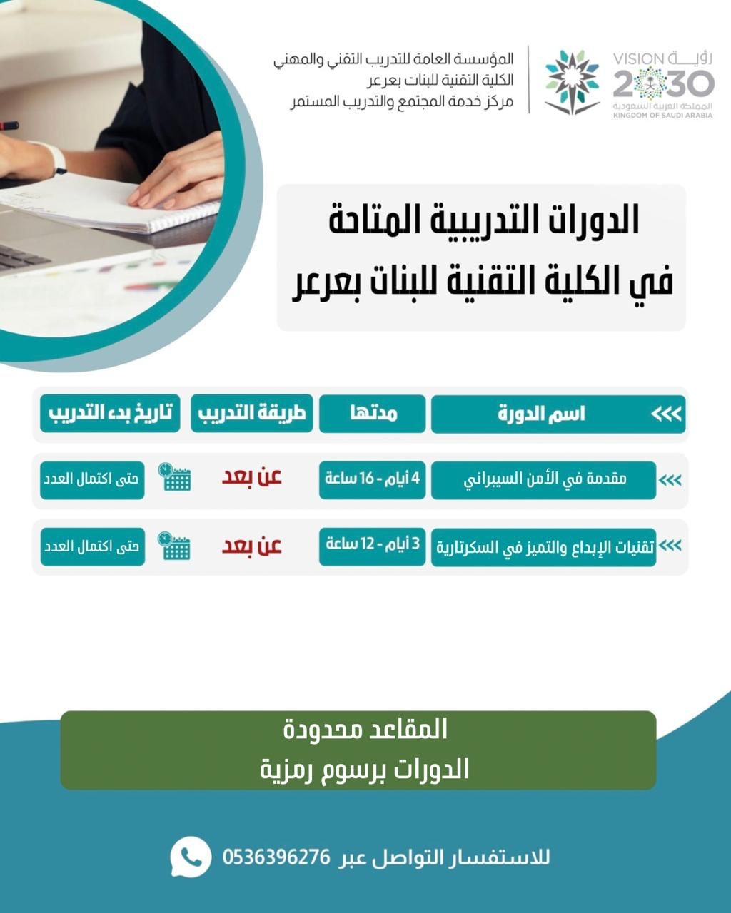 كلية التقنية للبنات بعرعر تعلن عن بدء التسجيل في عدد من البرامج التدريبية.