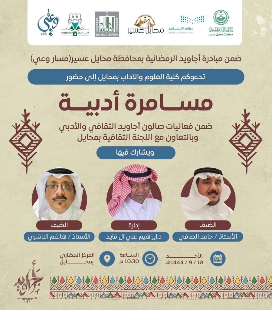 نظم الصالون الثقافي والأدبي بكلية العلوم والآداب بمحايل مسامرة أدبية، بالتعاون مع اللجنة الثقافية بمحايل، ضمن فعاليات مبادرة أجاويد التي أطلقتها هيئة تطوير عسير..