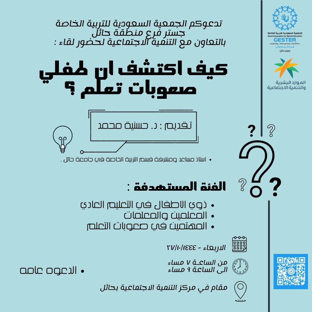ضمن الشراكة المميزة بين مركز التنمية الاجتماعية والجمعية السعودية للتربية الخاصة ( جستر ) فرع منطقة حائل ، أُقيمت دورةٌ متخصصة بعنوان ( كيف اكتشف أن طفلي صعوبات تعلم !؟ ) وتستهدف هذه الدورة ذوي الأطفال في التعليم العادي والمعلمين والمعلمات والمهتمين في صعوبات التعلم ، حيث شارك المركز بإتاحة القاعة التدريبية وإشراك عددٍ من المتطوعات يشرف عليهن قسم التطوع بالمركز للتنظيم والخروج بعملٍ مميز .