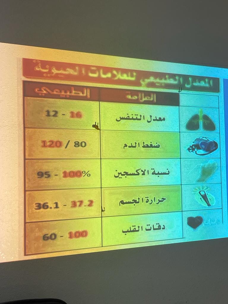 وخلال المحاضرة تم الحديث من عن العلامات التى تظهر على حالة المريض وعن المعدل الطبيعي لحرارة الجسم وضغط الدم ودقات القلب ومعدل التنفس ونسبة الأكسجين بالإضافة إلى النسبة الطبيعية للسكر في الدم وعن الوزن المثالي للمرأة التي يتناسب مع طولها ، وأيضًا عمل فحص وقياس الوزن وسكر الدم والضغط للحضور .