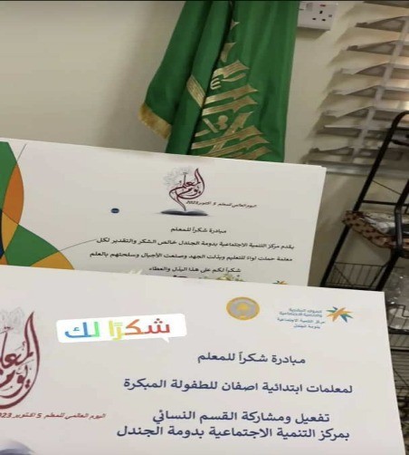 شارك القسم النسائي بمركز التنمية الاجتماعية بمحافظة دومة الجندل الاحتفاء باليوم العالمي للمعلم ضمن مبادرات المركز لتقديم الشكر والتقدير للمعلم في اليوم العالمي الموافق الخامس من أكتوبر في مجموعة من مدارس البنات تضمن التفعيل كلاً من متوسطة وثانوية الوادي والبحيرات ، الابتدائية الرابعة ، المتوسطة الثانية ، ابتدائية الاضارع للطفولة المبكرة ، ابتدائية أصفان للطفولة المبكرة ، حيث تم تكريم نخبة من المدرسات وتقديم الهدايا وباقات من الورود بهذه المناسبة .