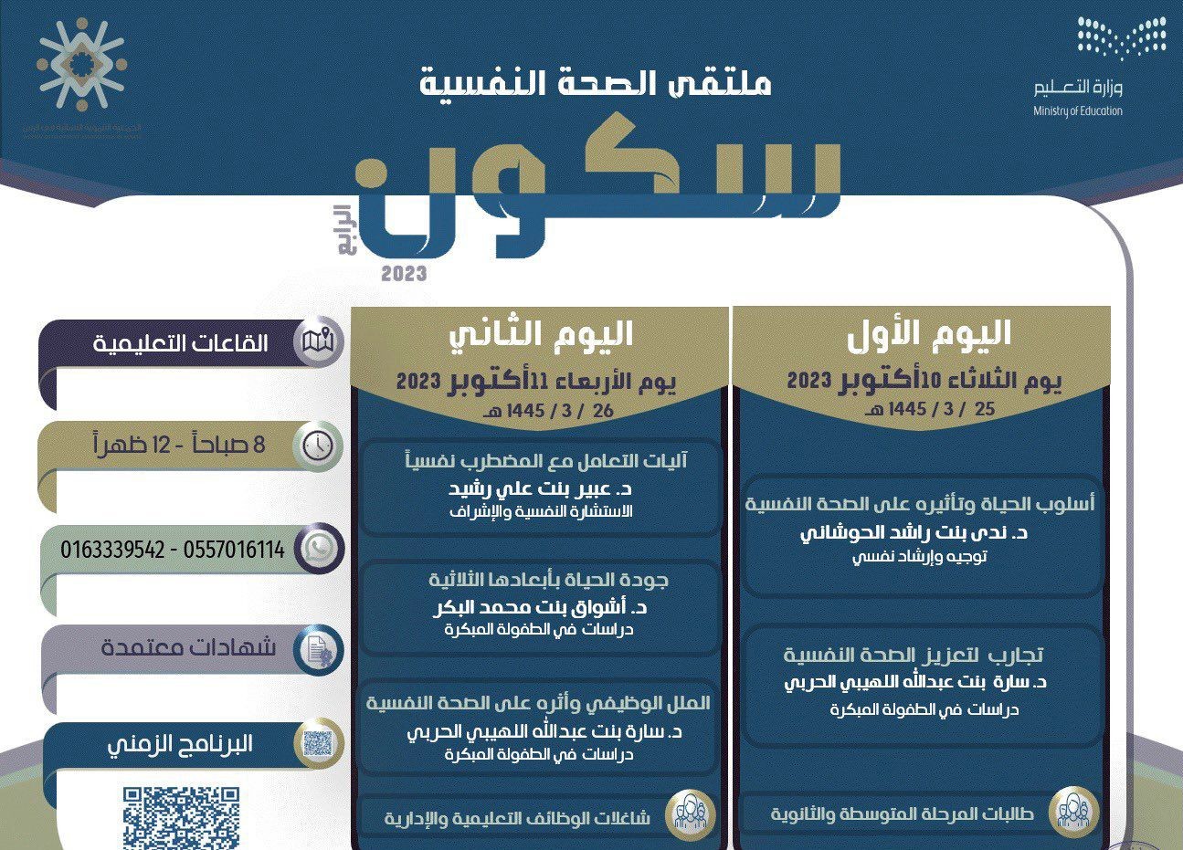 أختتمت مؤخرا الجمعية التنموية النسائية بالرس بالشراكة مع التعليم ملتقى “سكون” في دورته الرابعة والذي جاء على مدار يومين في القاعات التعليمية بإدارة التعليم.