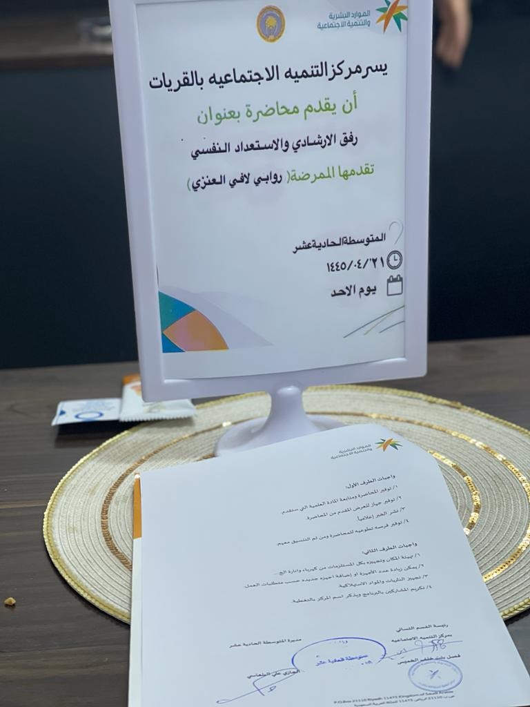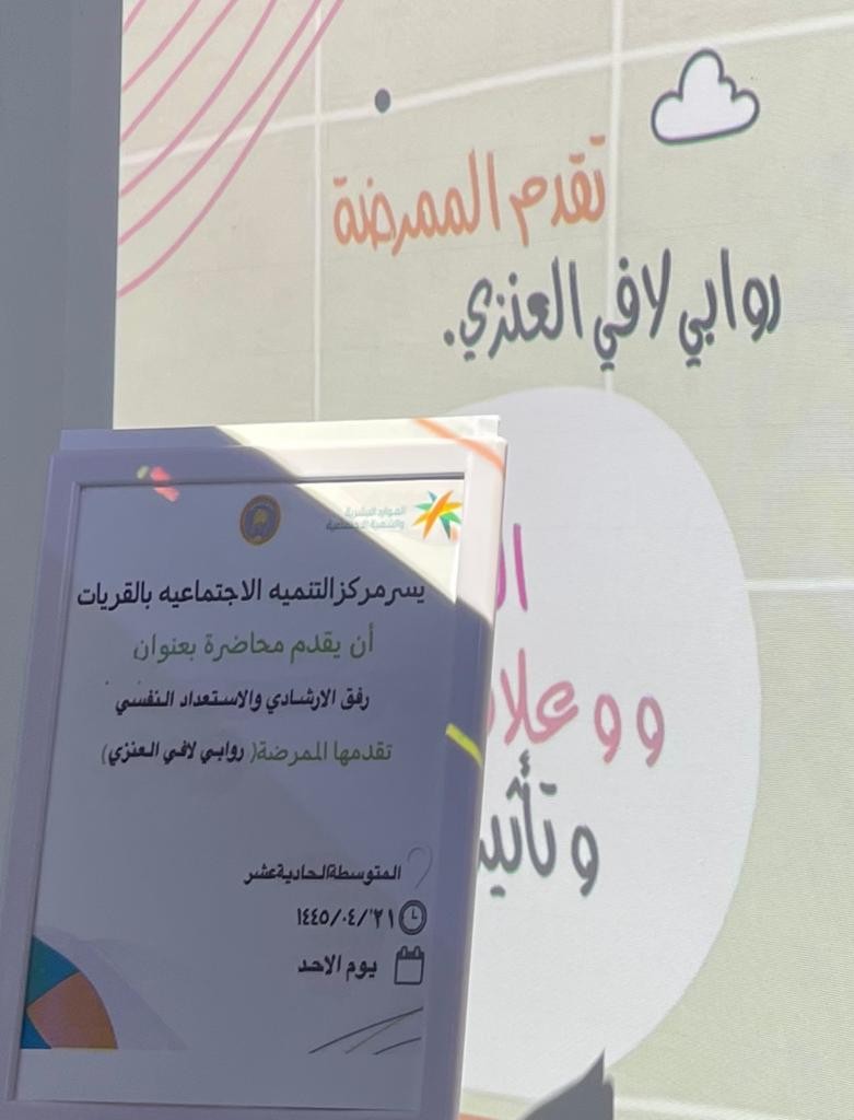 أقام مركز التنمية الاجتماعية بالقريات بالشراكة مع المتوسطة الحادية عشر ومستشفى الأمل للصحة النفسية محاضرة توعوية بعنوان ( رفق الإرشادي والاستعداد النفسي ) ،قدمتها الممرضة روابي لافي العنزي تطرقت فيها عن السلوك العدواني الغير مرغوب وطرق علاجه ، وسبب اختلال موازين القوة لدى الطالب ، وطرق علاجه بالإضافة إلى استعراض سبب تدني علامات الطالب الدراسي وفقدان التركيز و ضرورة عرض الطالب إلى أخصائي نفسي بحالة ظهور أعراض غير عادية عليه سواء كانت لفظيه أو جسديه أو اجتماعية.