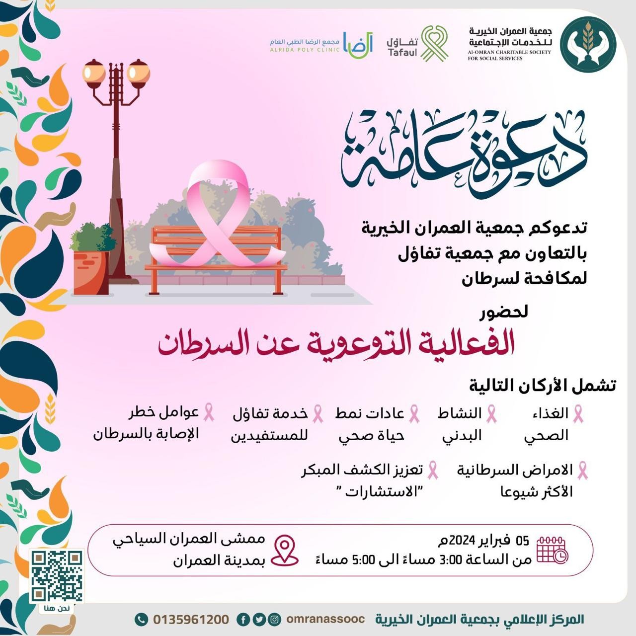 نظمت جمعية العمران الخيرية بمدينة العمران بالتعاون مع جمعية تفاؤل لمكافحة السرطان بالأحساء فعالية توعوية عن السرطان ، هذا اليوم الاثنين .
