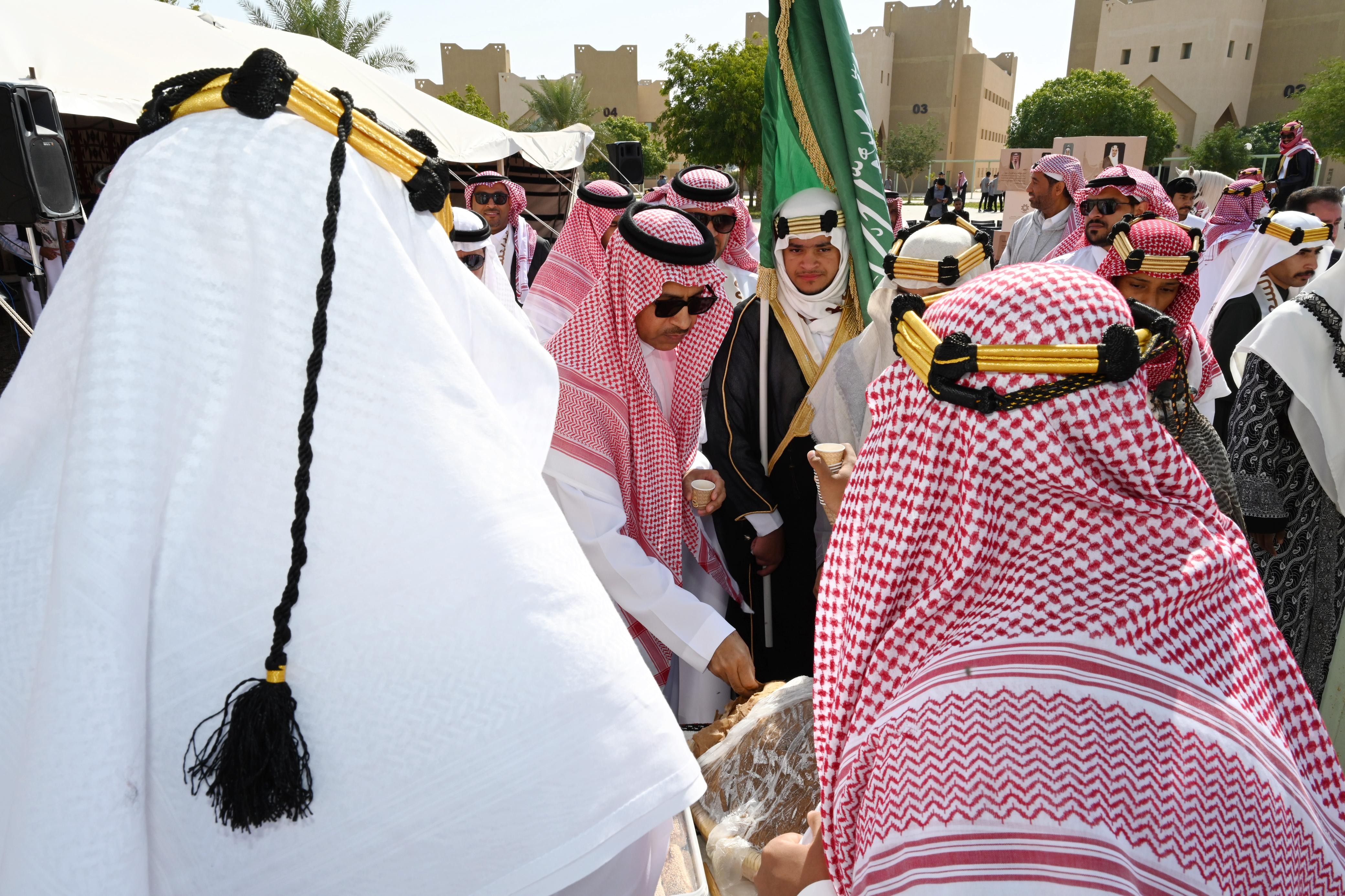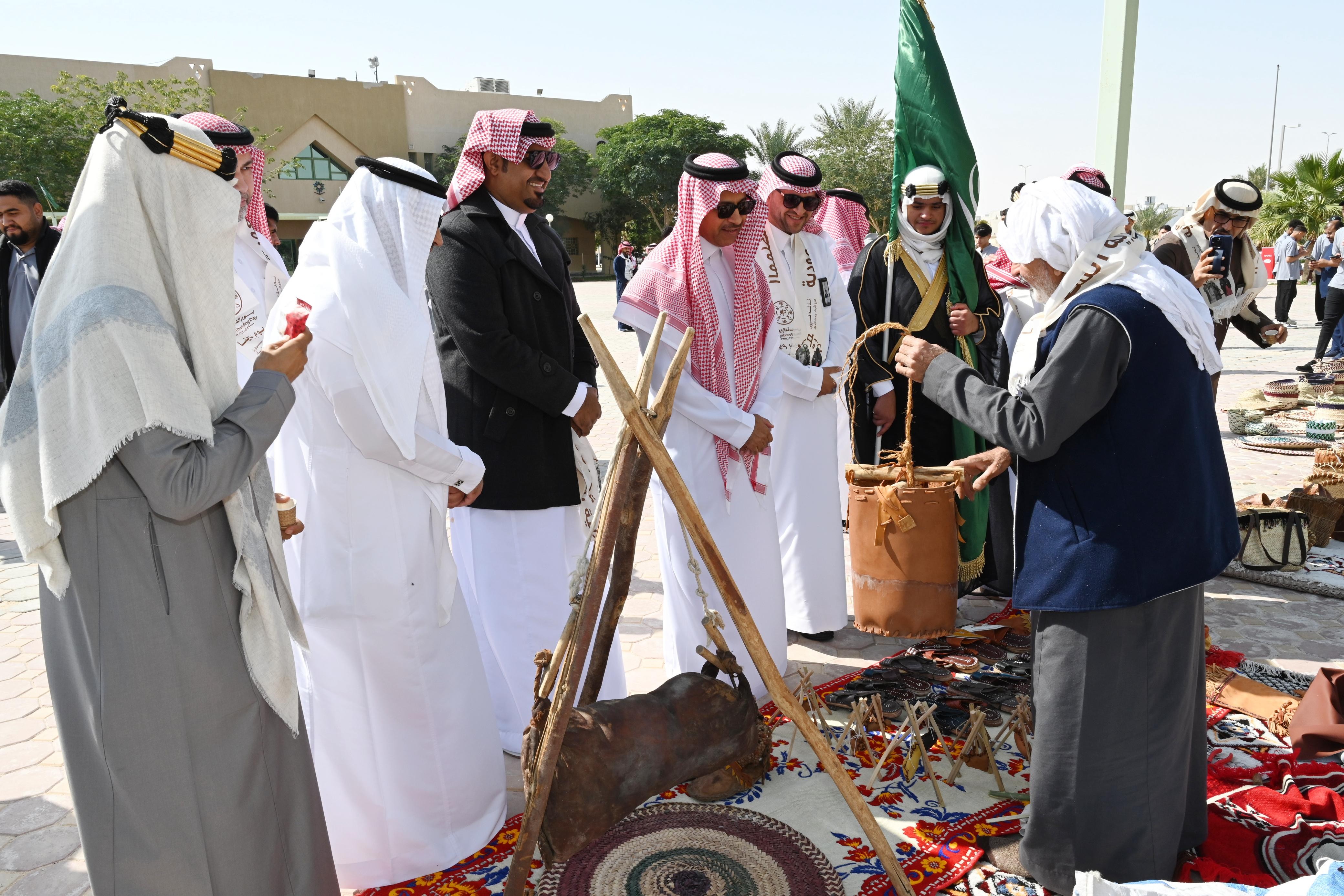 هذا واشتمل برنامج الاحتفال على (25) فعالية متنوعة في خيمة الفعاليات وخارجها منها المخيم التراثي ومعرض المهن التراثية الذي ضم (5) مهن حرفية وهي ( حرفي فخار -حرفي خوص – حرفي خراز – حرفي ملاييف – حرفي خياطة البشت ) وعروض الخيالة والصقور، والعرضة السعودية ،والأهازيج الوطنية ، وافضل زي خاص بالمناسبة ، وركن المأكولات والمشروبات التراثية ،والقصائد الوطنية ، ومسابقات ثقافية وتراثية خاصة بيوم التأسيس ، وكذلك تم إطلاق الحائط الالكتروني، ومسابقة أفضل فيديو – تغريدة – سنابه عن يوم التأسيس ، وتم خلال الحفل تكريم المشاركين في معرض المهن التراثية بشهادات شكر وتقدير وكذلك تم تكريم الفائزين وتوزيع الهدايا على المشاركين في المسابقات من قبل عميد الكلية.