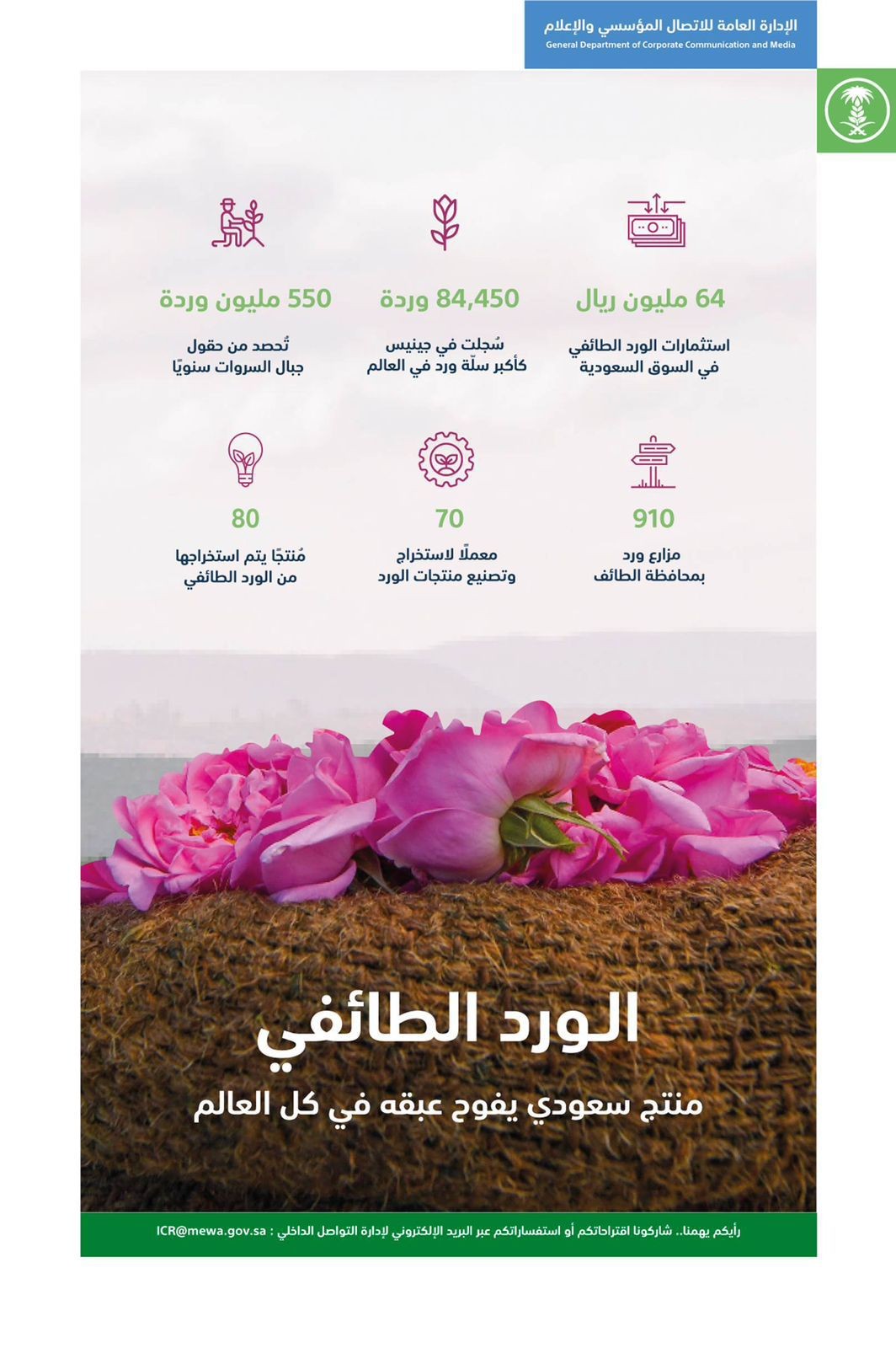 اوضح سعادة مدير عام فرع وزارة البيئة والمياه والزراعة بمنطقة مكة المكرمة المهندس ماجد بن عبدالله الخليف ان الوزارة تعمل مع الجهات ذات العلاقة، سواء على مستوى الزراعة أو على مستوى التصنيع على تطوير صناعة الورد الطائفي من خلال تأهيل المدرجات، وزيادة المساحات المزروعة، ودعم الصناعات التحويلية.