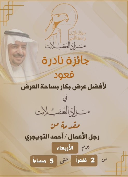 ومن المقرر أن تُقام فعالية الجائزة اليوم الأربعاء من الساعة الثانية ظهرًا وحتى الخامسة مساءً، وسط حضور عشّاق الإبل ومتابعي المزادات التراثية الذين اعتادوا أن يشهدوا في مزاد العقيلات روح المنافسة الأصيلة والاهتمام بالجمال والنقاء في سلالات الإبل.