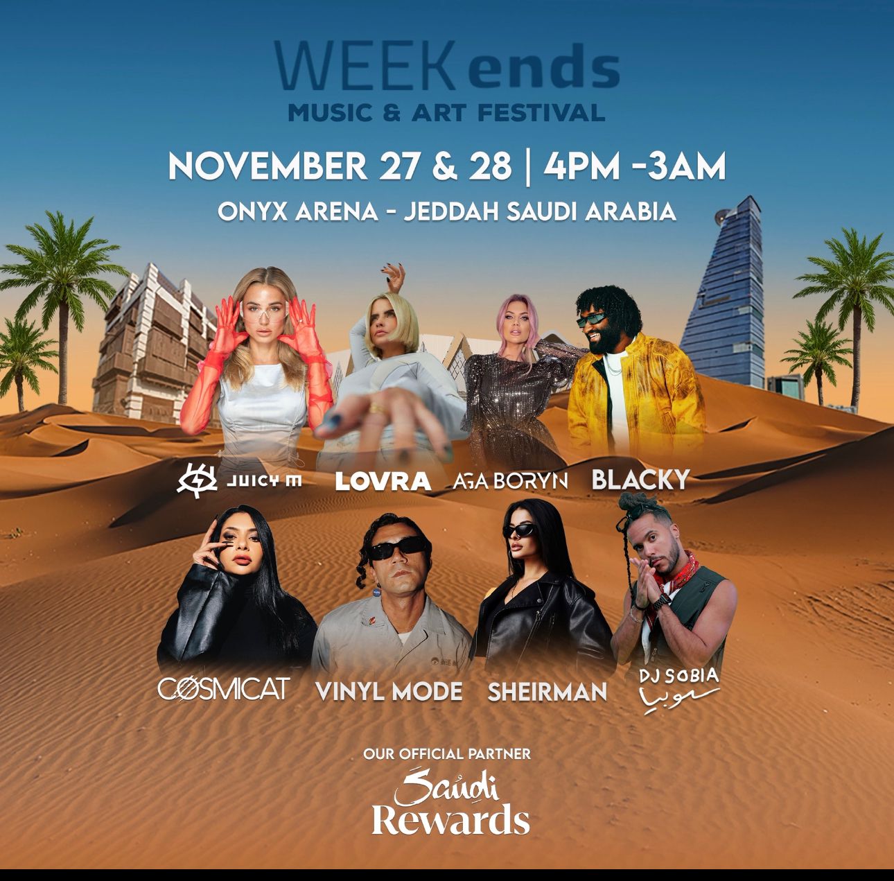 ويشارك في إحياء الحفلات نجوم عالميين، مثل الفنانة الأوكرانية Juicy M، والفنانة الألمانية LOVRA، والفنانة البولندية Aga Boryn، بالإضافة إلى نجوم محليين، مثل السعودية Cosmicat، والفنان السعودي Blacky والنجم Vinyl Mode السعودي . وغيرهم