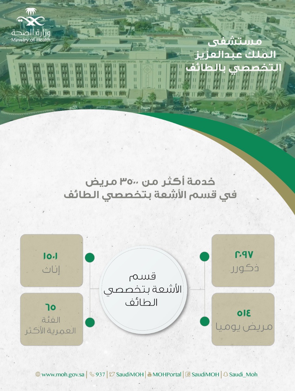 خدم قسم الأشعة بمستشفى الملك عبدالعزيز التخصصي بالطائف خلال الأسبوع المنصرم 3598 مريض ومراجع منهم 2097 من الذكور كان أكثر المستفيدين من الخدمات الاشعاعية المقدمة هم الفئات العمرية 65 عاما وأكثر حيث بلغ عدد المستفيدين 1264 مريض , وقد شكلت جائحة تفشي فيروس كورونا والإجراءات الوقائية المتخذة من قبل الصحة إضافة إلى تحويل مجمع الملك فيصل الطبي لمركز كورونا تحديا كبيرا للكوادر العاملة في قسم الأشعة خاصة مع زيادة أعداد المراجعين والمرضى .