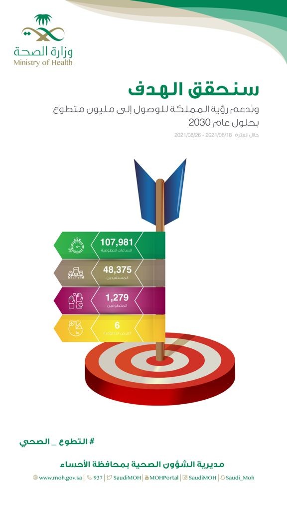 تسعى الادارة الاشرافية للتطوع الصحي بصحة الأحساء نحو تحقيق هدف الوصول الى مليون متطوع لدعم لرؤية المملكة بحلول عام ٢٠٣٠.