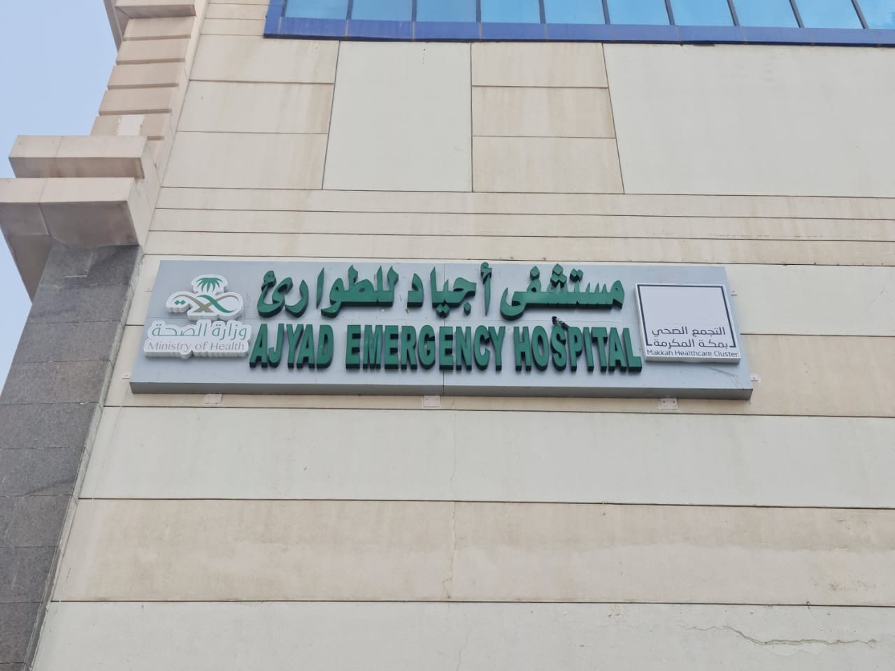 شعار التجمع الصحي بمكة المكرمة للوحة التعريفية للمنشأة الصحية المتمثلة بمستشفى أجياد للطوارئ تتوسط مبنى أبراج الصفوة التجارية الواقع بساحة الحرم المكي الشريف.