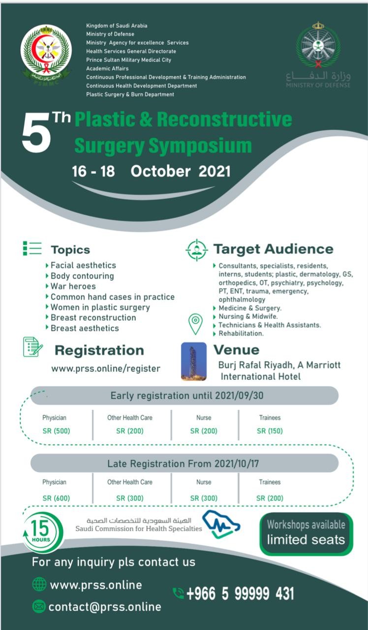 تنظم مدينة الأمير سلطان الطبية العسكرية الملتقى الخامس للجراحة التجميلية والترميمية في السادس عشر من أكتوبر القادم ولمدة ثلاثة أيام بفندق رافال كمبنيسكي بالرياض.