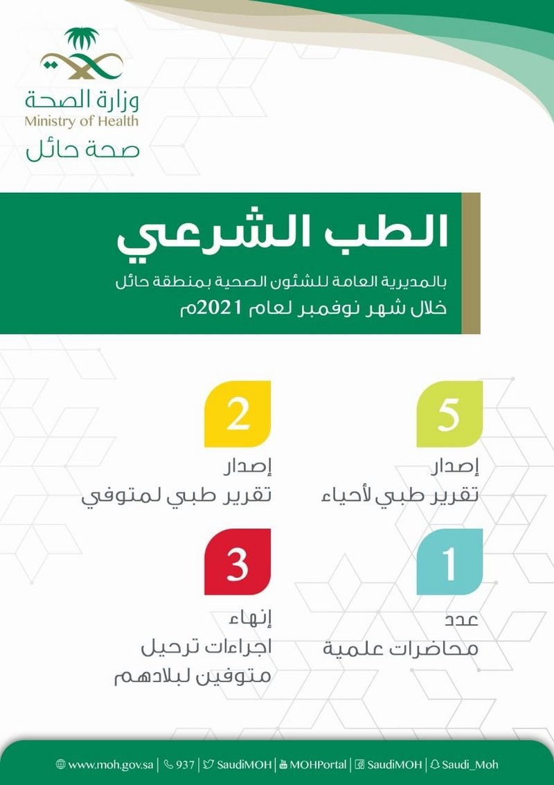 الطب الشرعي بصحة حائل يصدر 7 تقارير طبية خلال شهر نوفمبر 2021م