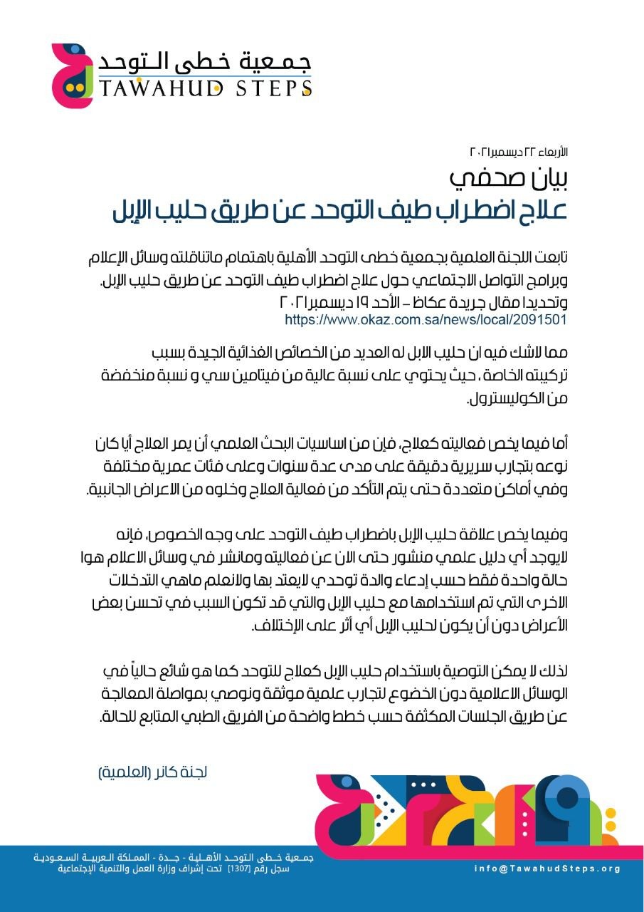 حذرت اللجنة العلمية (كانر) لجمعية خطى التوحد الأهلية بجدة مما تناقلته وسائل الإعلام وبرامج التواصل الاجتماعي حول علاج اضطراب طيف التوحد عن طريق حليب الإبل ، لافتة إلى أنه لا يوجد مستند أو بحث علمي أو تجارب تثبت ذلك.