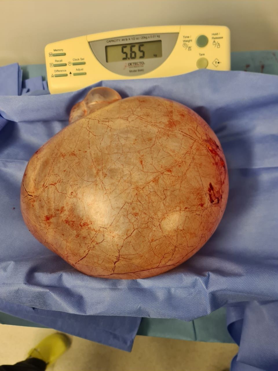 وأوضح الدكتور بغدادي استشاري النساء والولادة أن المريضة كانت تراجع بعيادة النساء والولادة وتم من خلالها عمل كافة الفحوصات اللازمة وإخضاعها لعمل أشعة الرنين المغناطيسي (M.R.I.) ، وبعد عمل هذه الفحوصات تم اكتشاف ورم يبلغ أبعاده إلى ٢٥ X ٢٥ سم كما أوضح أن الورم يزن ٦ كجم وتم التنسيق لتنويم المريضة بعد تحضيرها لعملية استئصال الورم ، وعن العملية أفاد أن الجراحة استغرقت مدة ساعتين