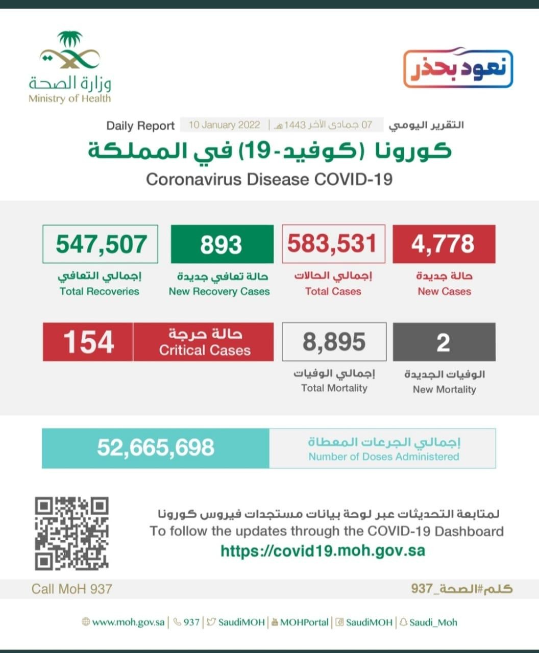 أعلنت وزارة الصحة، اليوم الاثنين 10 يناير 2022، تسجيل 4778 حالة إصابة جديدة بفيروس كورونا الجديد (كوفيد-19)، ليصبح الإجمالي 583531 حالة.