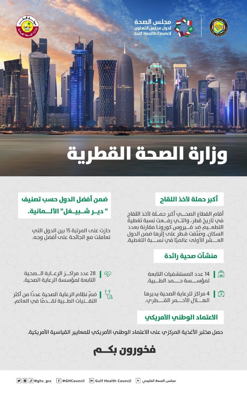 نشر مجلس الصحة الخليجي عبر حساباته الرسمية في مواقع التواصل الاجتماعيه (انفوجرافيك) يتضمن أهم الجهود والمنجزات الطبية التي قدمتها وزارة الصحة القطرية بكوادرها الوطنية في ضل استمرار جائحة كورونا .