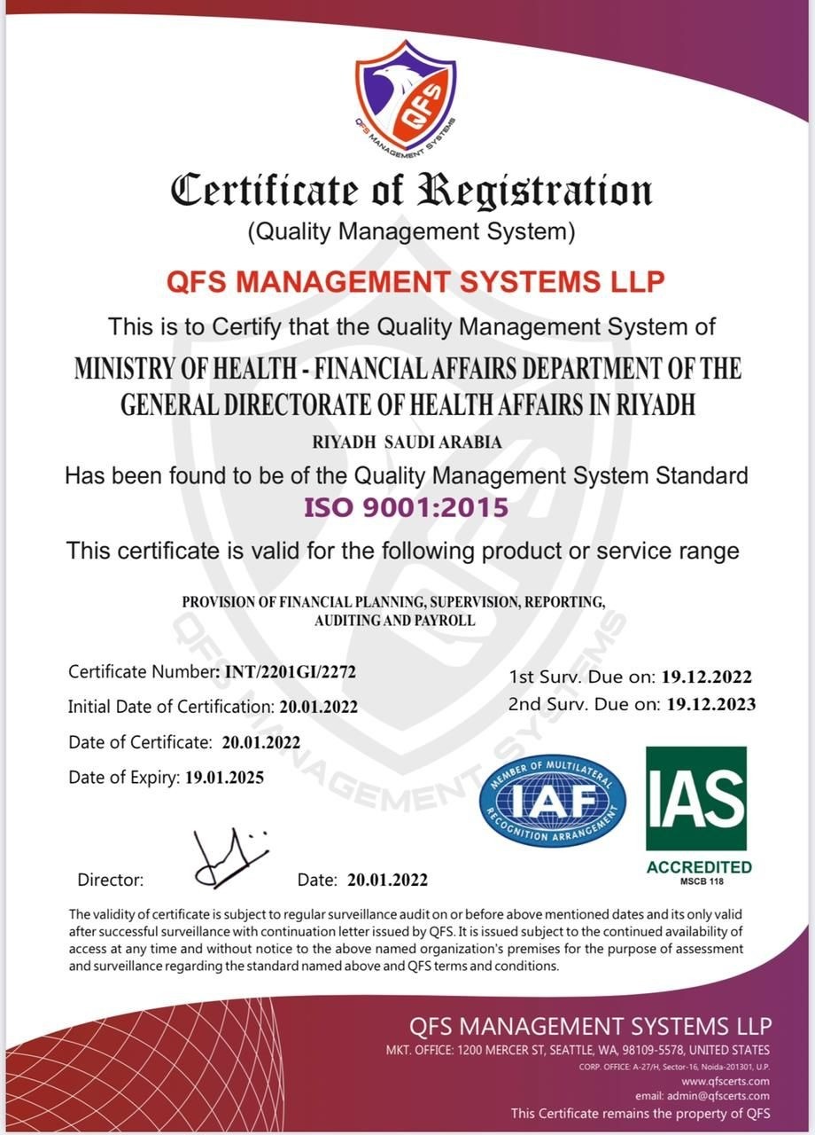حصلت المديرية العامة للشؤون الصحية بمنطقة الرياض، ممثلةً في الإدارة المالية على شهادة منظمة المقاييس الدولية ISO 9001:2015، لإكمالها بنجاح تطبيق كافة المعايير القياسية في نظام إدارة الجودة.
