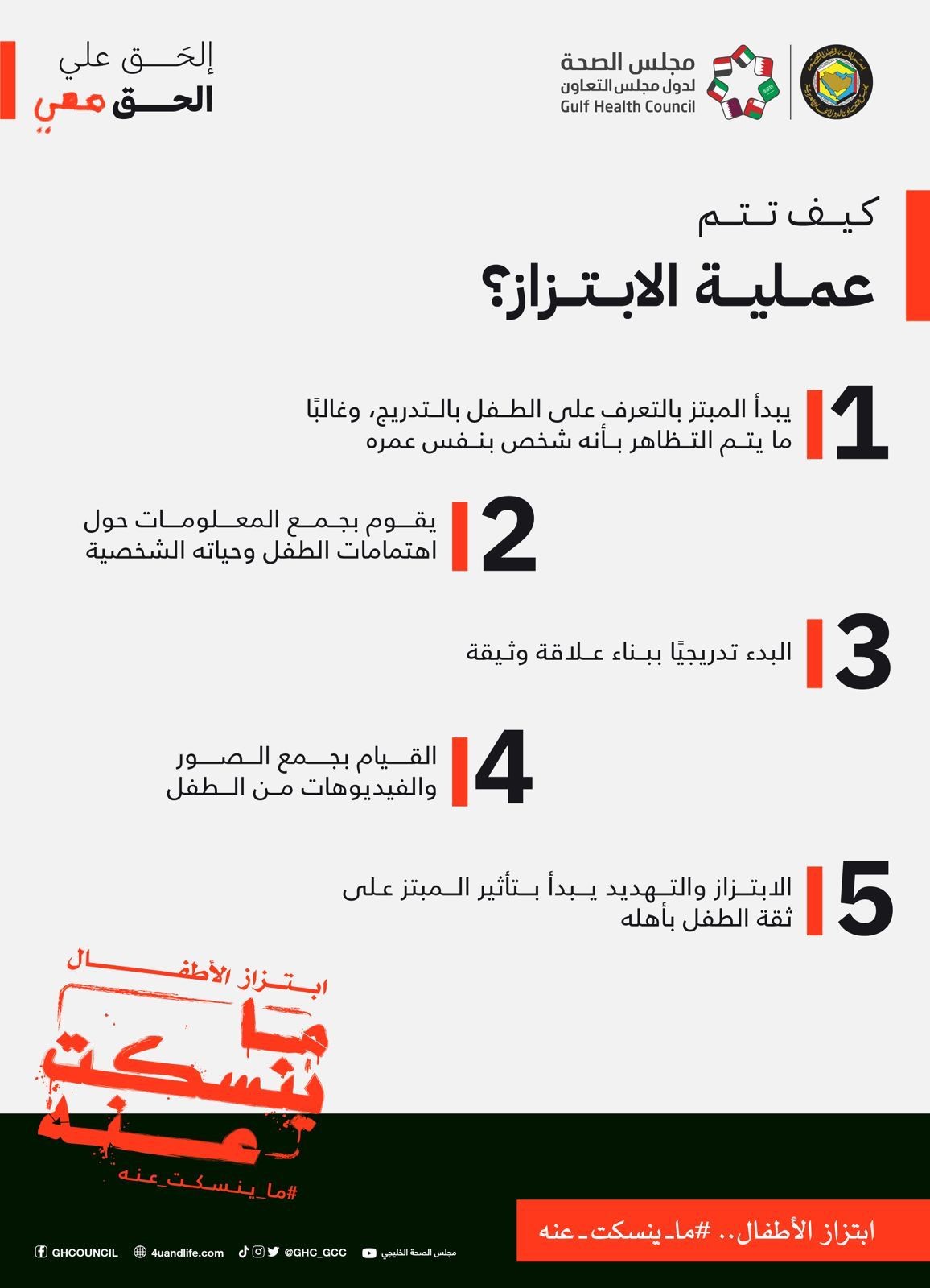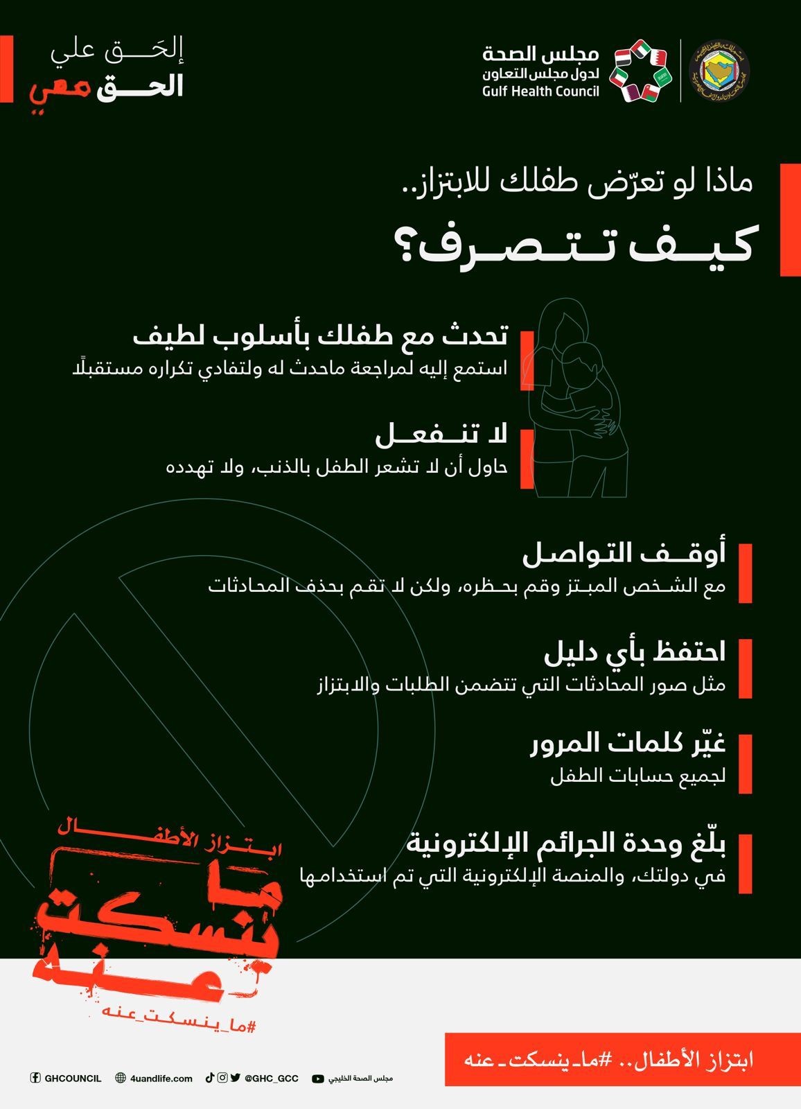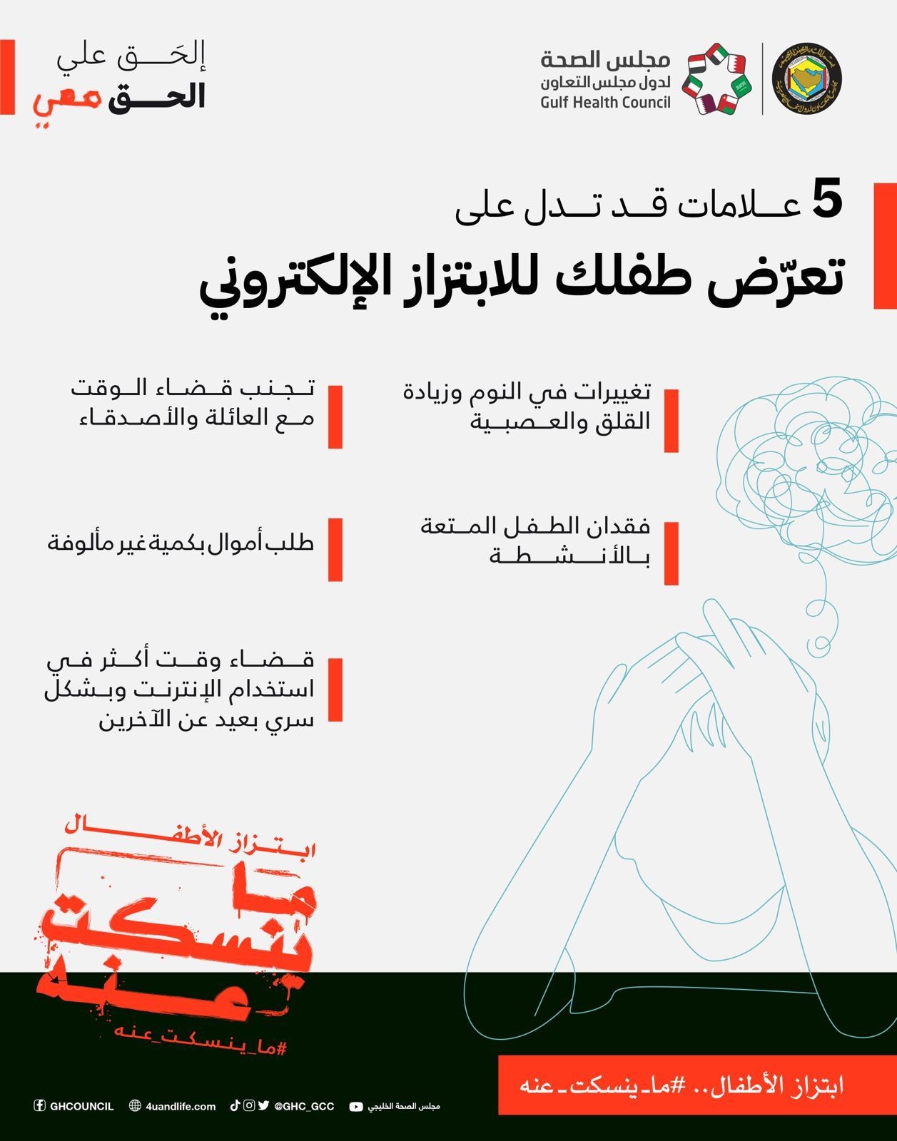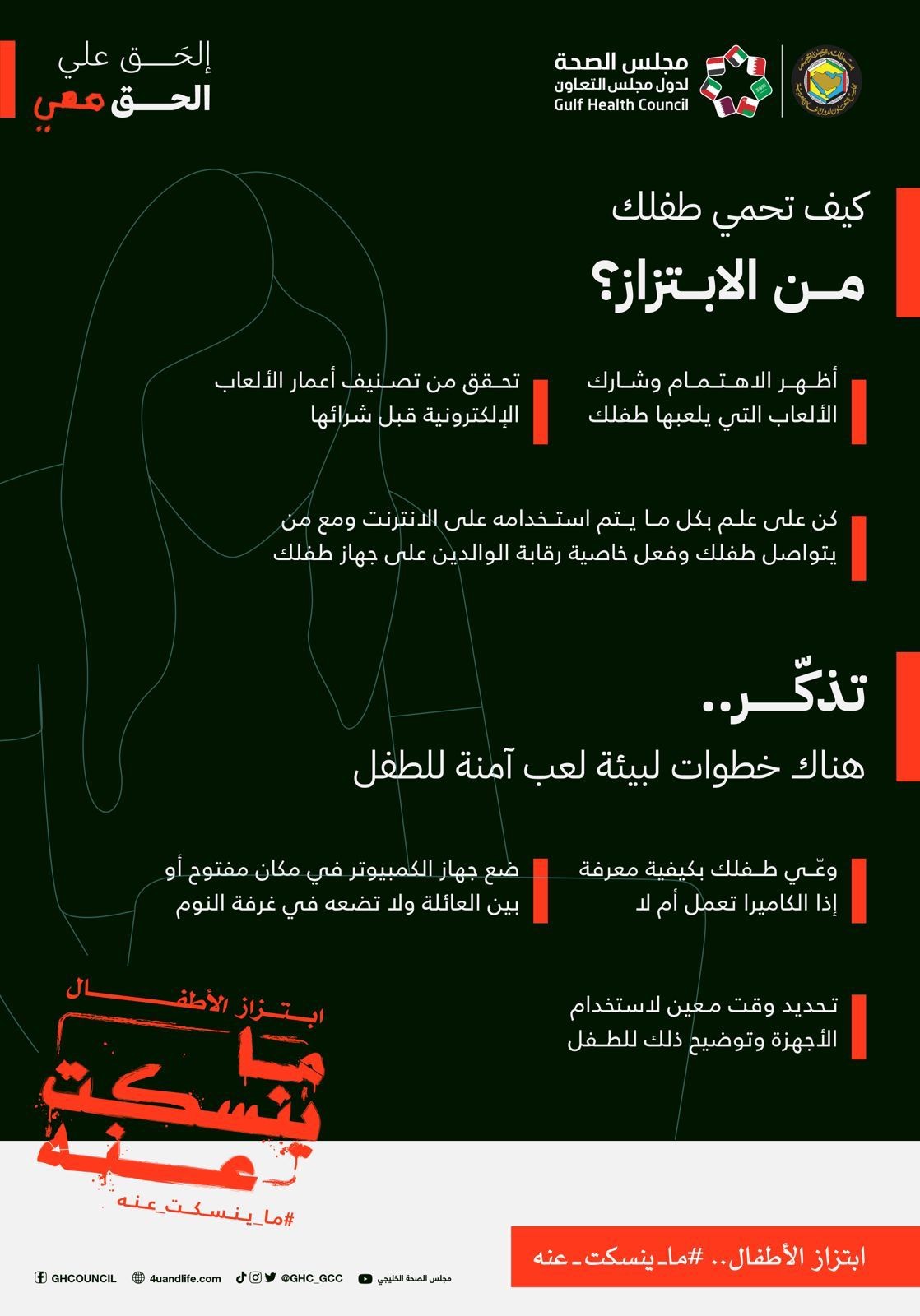 أطلق مجلس الصحة لدول مجلس التعاون الخليجي اليوم حملة تحت عنوان (ماينسكت عنه) وتسلط الضوء حول ابتزاز الأطفال الكترونياً بمختلف أشكاله، وذكر المجلس بأن الابتزاز له عدة اوجه منها الابتزاز الإلكتروني وله عدة أشكال من خلال الألعاب الإلكترونية او منصات التواصل الاجتماعي، كالابتزاز العاطفي بطلب صور وفيديوهات او معلومات شخصية من الطفل يستعملها المبتز للتأثير على مشاعر الطفل والتحكم به، وأيضاً الإبتزاز الأخلاقي ويكون بطلب فعل عمل غير أخلاقي أو أي عمل آخر لا يرغب الطفل بعمله كطلب اللقاء به، وآخرها الابتزاز المادي ويكون بطلب تحويل أموال أو هدايا للمبتز.
