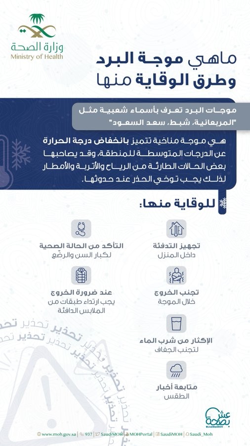 وأوضحت الوزارة أهم طرق الوقاية من نزلات البرد مثل تجهيز التدفئة داخل المنزل، وتجنب الخروج خلال الموجة، والإكثار من شرب الماء لتجنب الجفاف، ومتابعة أخبار الطقس، والتأكد من الحالة الصحية لكبار السن والرضع، وارتداء طبقات من الملابس الدافئة عند ضرورة الخروج.