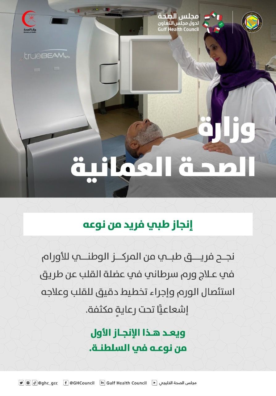 أشاد مجلس الصحة لدول مجلس التعاون اليوم الإربعاء بالإنجاز الطبي الذي حققته وزارة الصحة العمانية بالمركز الوطني للأورام بكوادرها الوطنية ، وذلك في علاج ورم سرطاني بعضلة القلب وكان هذا عن طريق استئصال الورم وإجراء تخطيط دقيق للقلب وعلاجة إشعاعياً تحت رعاية طبية مكثفة.