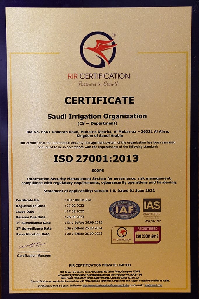 حصلت المؤسسة العامة للري ممثلة في قسم الأمن السيبراني على شهادة الايزو27001:2013 في نظام إدارة أمن المعلومات سعياً لتحقيق إدارة أمن الأصول المعلوماتية، إلى جانب حمايتها، ويساعد المعيار على تطوير آلية العمل وتحسينها بصورة مستمرة لمواكبة التحديات والمخاطر الحالية والمستقبلية وفق أفضل الممارسات الدولية.