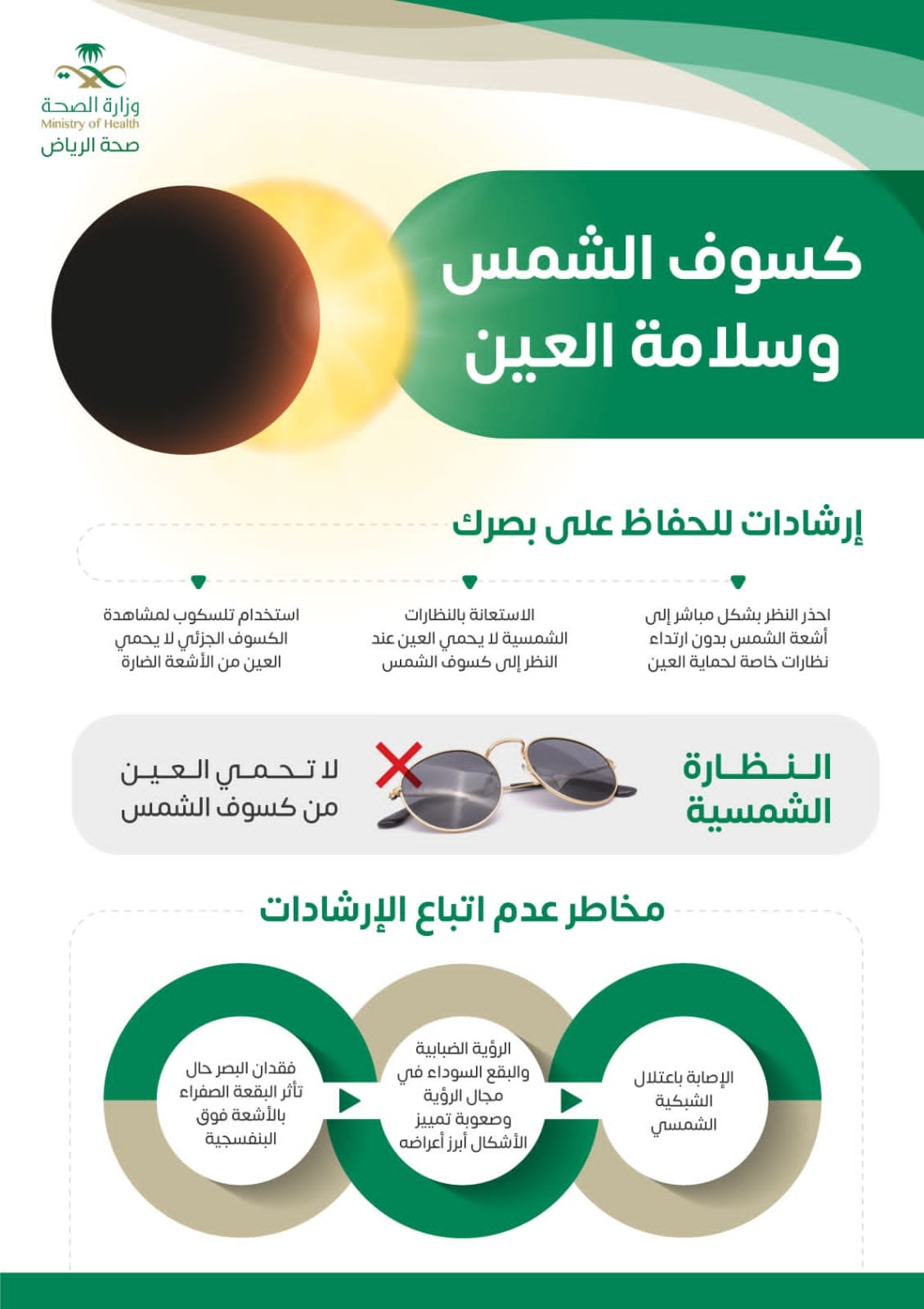 وأطلقت "صحة الرياض" عدة توجيهات منها عدم النظر بشكل مباشر إلى أشعة الشمس، وأن الاستعانة بالنظارات الشمسية لا يحمي العين عند النظر إلى كسوف الشمس، كما أن استخدام التلسكوب لمشاهدة الكسوف الجزئي لا يحمي العين من الأشعة الضارة، لافتة أن أشعة الشمس تمثل خطرًا جسيمًا، لأنها يمكن أن تخترق شبكية العين؛ وتؤدي إلى حرق بمركز الرؤية ثم حدوث تليف وتلف بالعين، وتكمن الخطورة في أن شبكية العين لا تستشعر الألم، وبالتالي لن يشعر الإنسان بحدوث ذلك، وقد لا تظهر التأثيرات إلا بعد ساعات من الضرر.