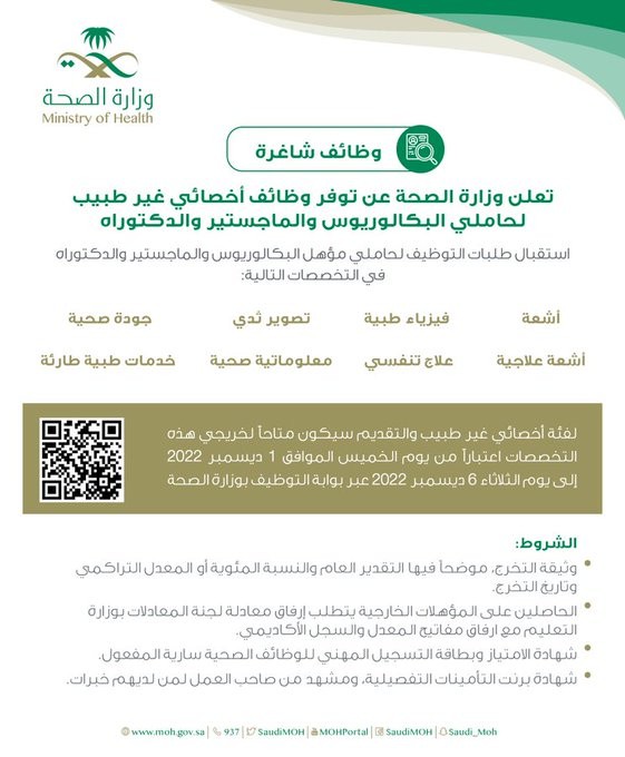 #وظائف_شاغرة لحملة البكالوريوس فأعلى بعدة تخصصات بوزارة الصحة