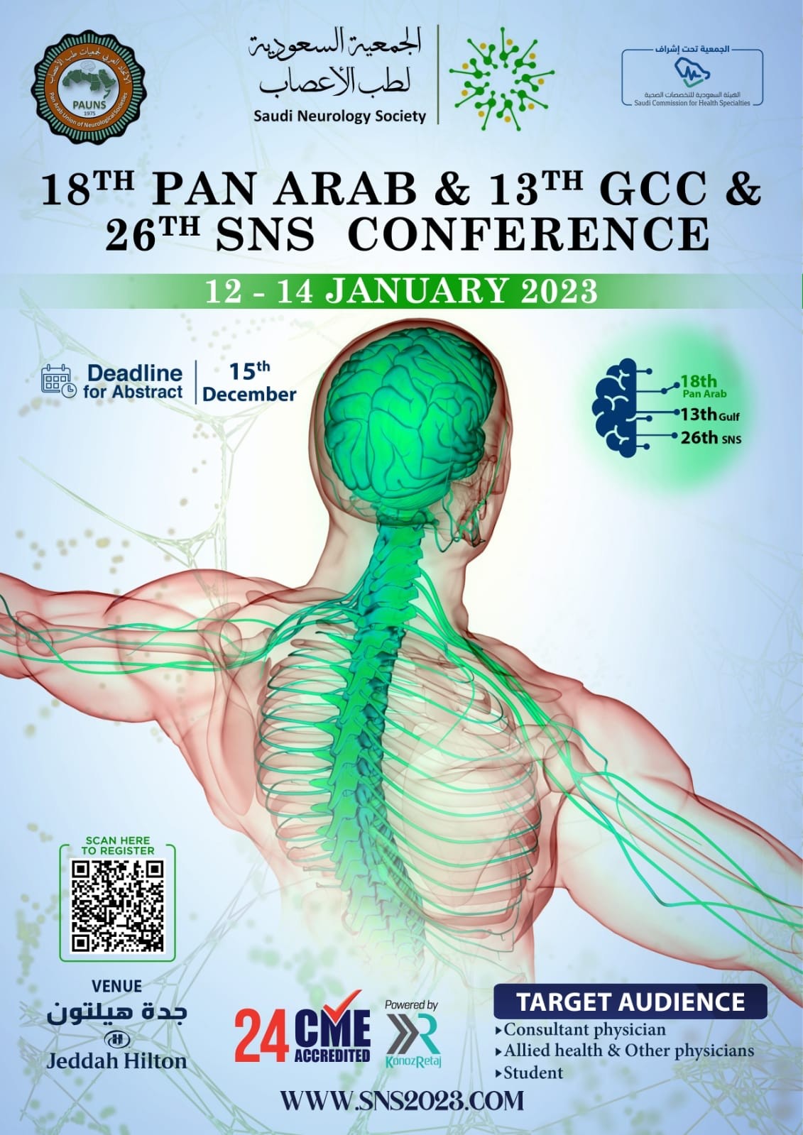 تقييم الجمعية السعودية لطب الأعصاب المؤتمر الثامن عشر للاتحاد العربي والثالث عشر الخليجي والسادس والعشرون السعودي لطب الأعصاب خلال الفترة من 12-14 يناير 2023 م في فندق الهيلتون بمدينة جدة  حيث يشارك بالمؤتمر متحدثون من المملكه ومن بعض الدول العربية والدول الاجنبيه  ، كما ويشارك بالمؤتمر العديد من الجمعيات العالمية والإقليمية والمحلية مثل: الاتحاد العالمي لطب الأعصاب بوجود رئيس الاتحاد العالمي، والجمعية الأمريكية لطب الأعصاب بوجود رئيس الجمعية ،  والجمعية البريطانية لطب الأعصاب بوجود رئيس الجمعية ، والجمعية الاسيوية لطب الأعصاب بوجود رئيس الجمعية ، والجمعية الأفريقية لطب الأعصاب بوجود رئيس الجمعية ، والاتحاد العربي لطب الأعصاب بوجود رئيس الاتحاد العربي ، والاتحاد الخليجي لطب الأعصاب بجميع أعضاءه ورؤساء الجمعيات لطب الأعصاب في الوطن العربي  وجمعية الصرع السعودية وجمعية الجلطة السعودية  بالإضافة إلى عدد كبير من الممارسين الصحيين من داخل المملكة العربية السعودية وخارجها، كما سيقام على هامش المؤتمر ورش عمل مخصصة لأحدث التقنيات في مجال طب الأعصاب.