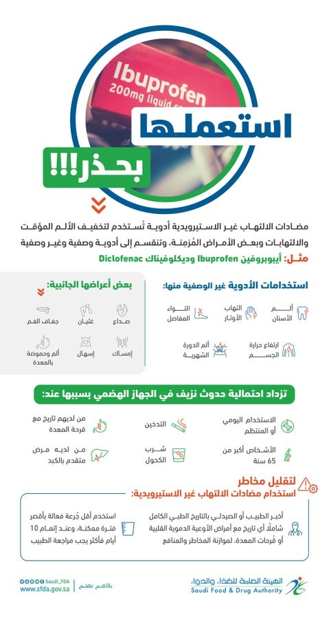 دعت الهيئة العامة للغذاء والدواء إلى استخدام مضادات الالتهاب غير الاستيرويدية بحذر، مثل (أيبوبروفين)، لأنها قد تزيد من احتمالية حدوث نزيف في الجهاز الهضمي.