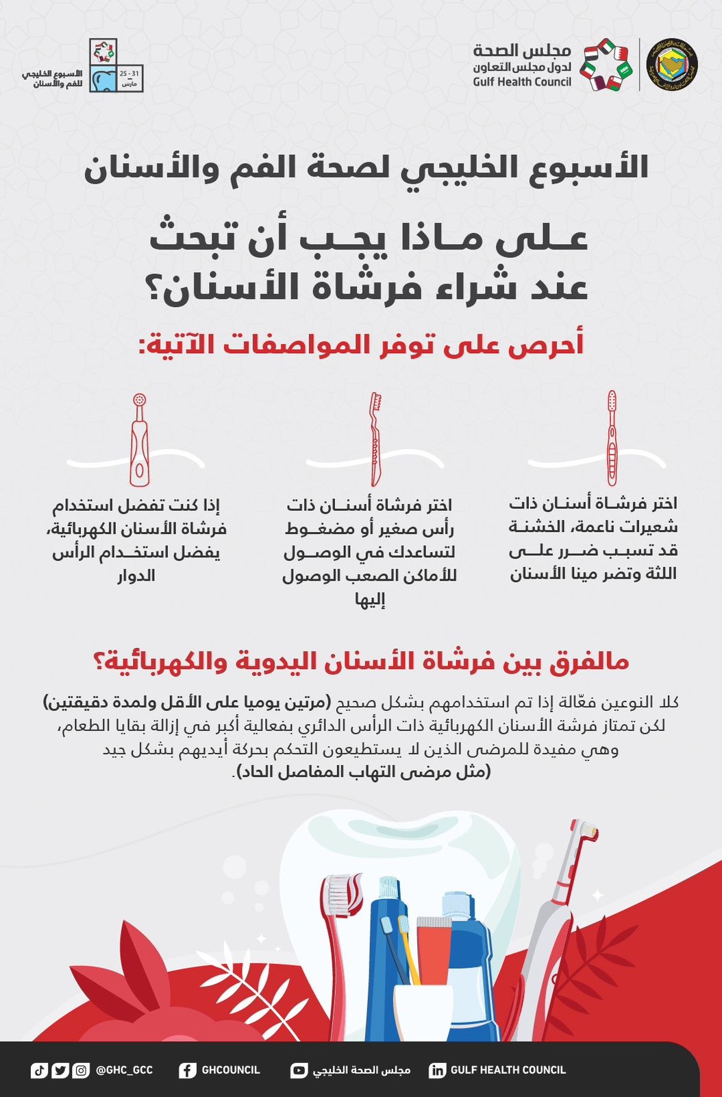 وأختتم المجلس حديثة بنصائح يجب توفرها عند شراء فرشاة الأسنان وهي على النحو التالي: إن تكون فرشاة الأسنان ذات شعيرات ناعمة لأن الخشنة قد تسبب ضررا على اللثة وميناء الأسنان، وأيضا اختيار فرشة أسنان ذات رأس صغير أو مضغوط لتساعدك في الوصول للأماكن الصعب الوصول لها، ولمن يفضلون استخدام فرشاة الأسنان الكهربائية يفضل استخدامه للرأس الدائري.