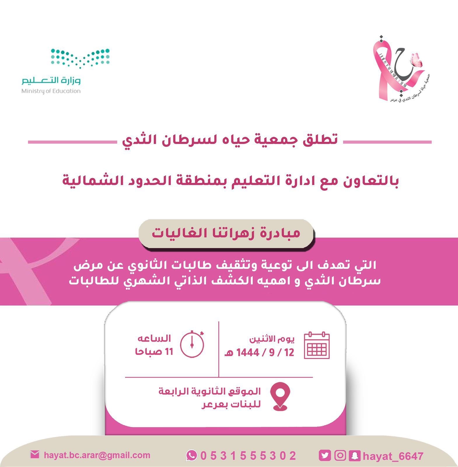 دشنت جمعية “حياة لسرطان الثدي” مبادرة “زهراتنا الغاليات” وذلك بالتعاون مع الإدارة العامة للتعليم بمنطقة الحدود الشمالية.
