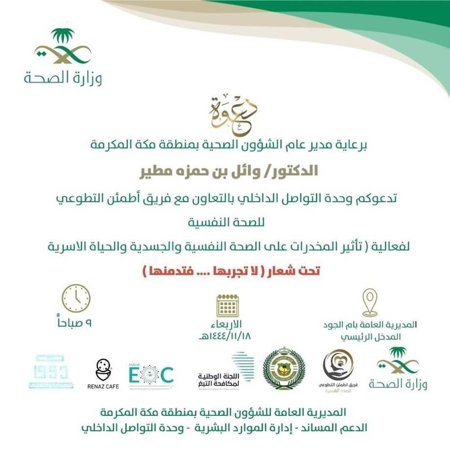 بمشاركة مكافحة المخدرات : صحة مكة تطلق مبادرة "لا تجربها فتدمنها"