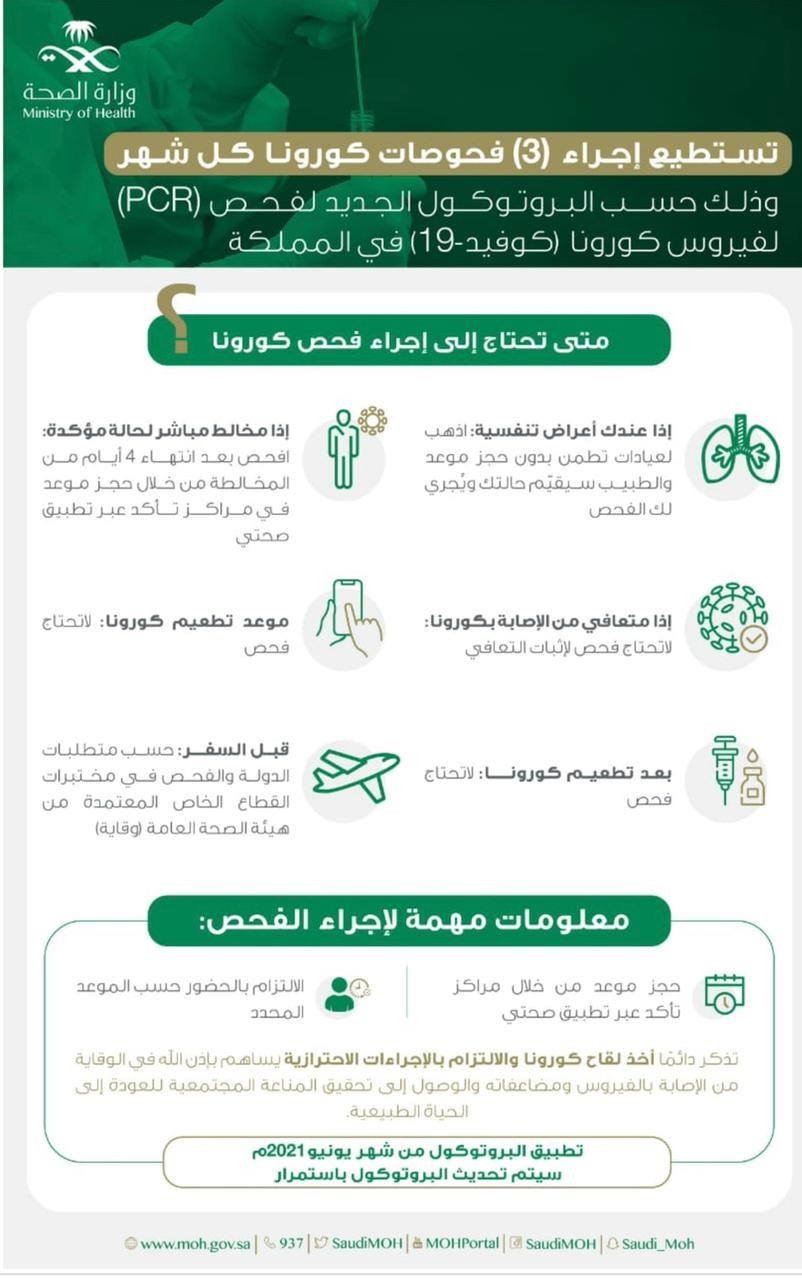 أكدت وزارة الصحة إن البروتوكول الجديد لفحص (PCR) لفيروس كورونا في المملكة، يتيح إمكانية إجراء 3 فحوصات لكورونا كل شهر.
