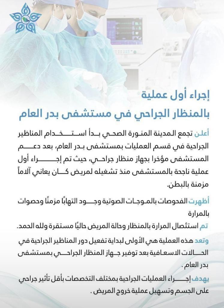 أجريت بمستشفى بدر العام بالمدينة المنورة أول عملية ناجحة باستخدام المنظار الجراحي، لمريض كان يعاني آلاماً مزمنة في البطن.