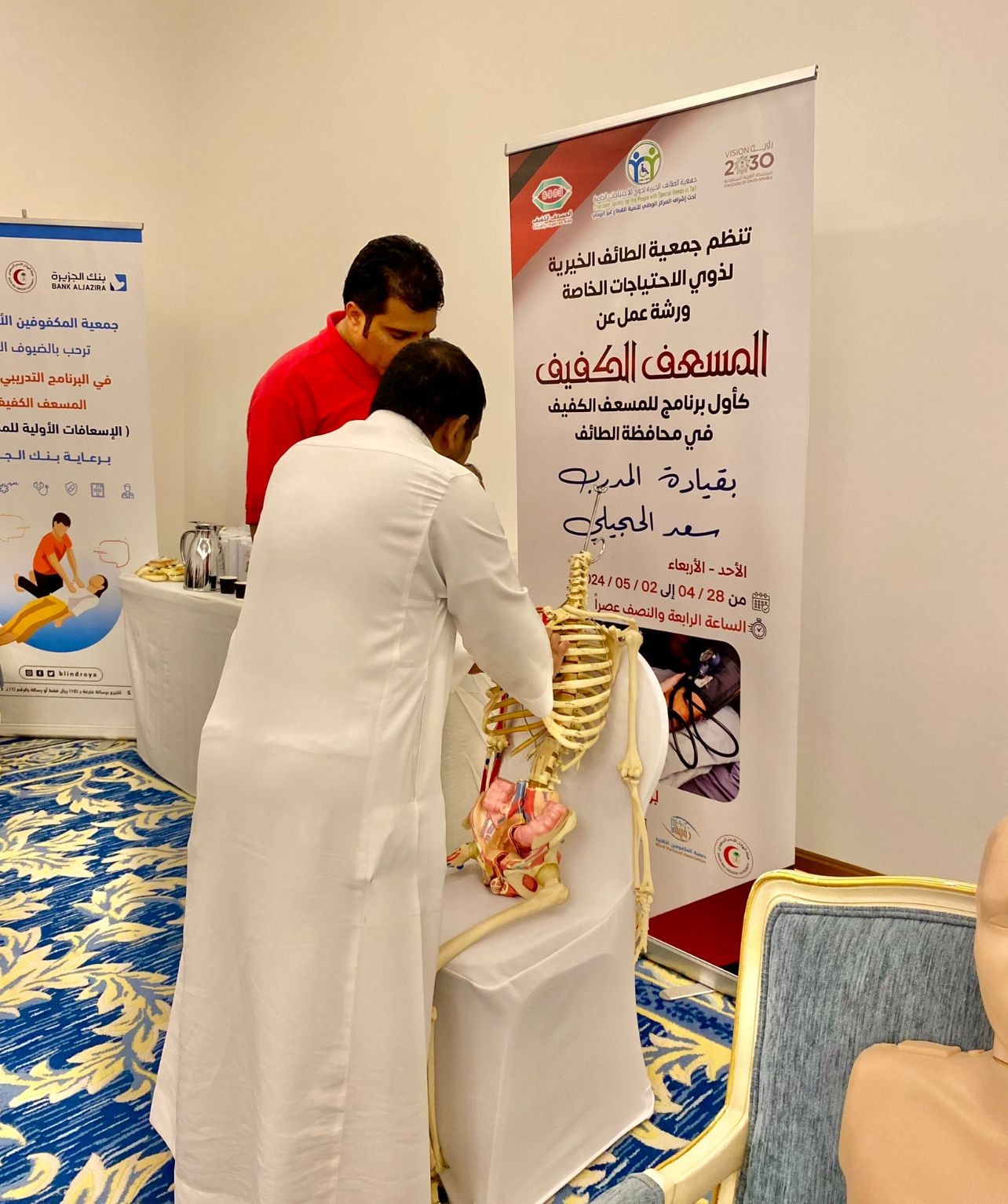 هذا وقدّم البرنامج أربعة مدربين مختصين من الهيئة والذين يحظون بقدر من الكفاءة والعلم وكيفية التعامل مع المكفوفين وكيفية تدريبيهم عبر الوسائل الملاءمة لهم، وتحرص الهيئة بشكل دائما ومستمر علي تدريب كافة افراد المجتمع مواطنين ومقيمين من خلال مركز التدريب والتثقيف المجتمعي بالمنطقة لرفع التوعية بالإسعافات الأولية.