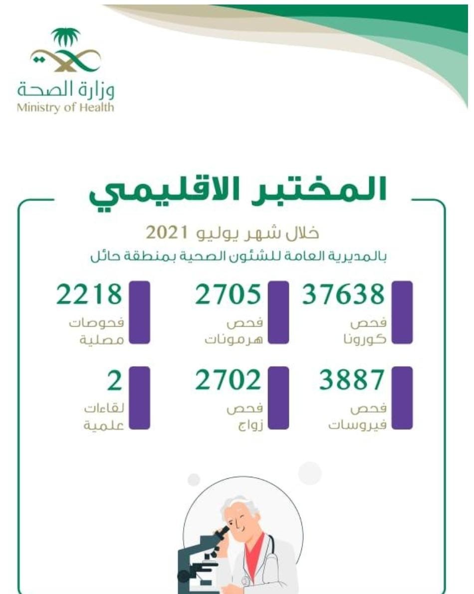 أجرى المختبر الإقليمي بصحة منطقة حائل خلال شهر يوليو من هذا العام 37638 فحوص كورونا، كما أجرى 3887 فحص فيروسات، و 2702 فحص زواج، و 2705 فحص هرمونات، و 2218 فحصًا مصليًّا، ونفذ عدد لقاءين علميين .