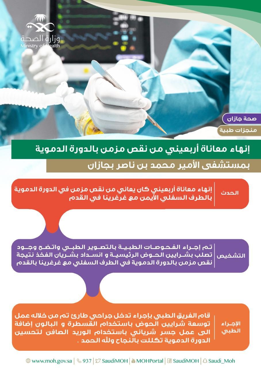 قالت الصحة في جازان بأن مركز جراحة القلب والأوعية الدموية بمستشفى الأمير محمد بن ناصر بجازان تمكن من إنهاء معاناة أربعيني كان يعاني من نقص مزمن في الدورة الدموية بالطرف السفلي الأيمن مع غرغرينا في القدم وذلك بإجراء تدخل جراحي طارئ تكلل بالنجاح ولله الحمد
