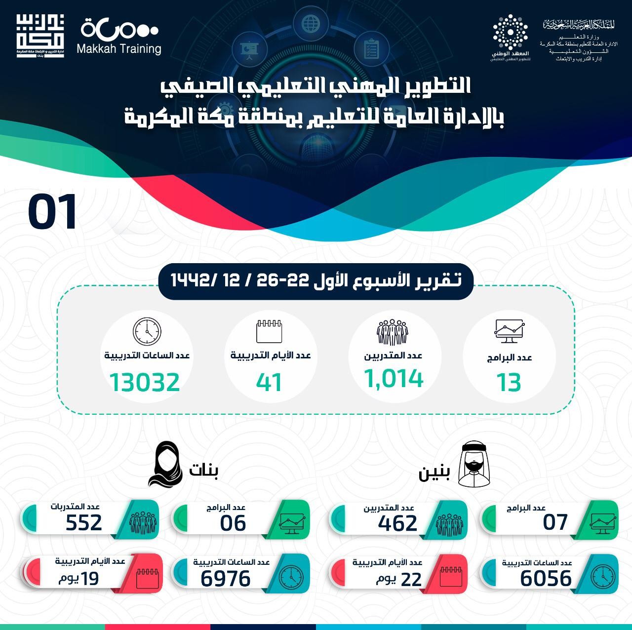 انطلقت بالإدارة العامة للتعليم بمنطقة مكة المكرمة ممثلةً بإدارة التدريب والابتعاث ( بنات _ بنين) حزمةً من البرامج التدريبيةِ المكثفة، استهدفت شاغلي وشاغلات الوظائف التعليمية، وذلك بهدف التطوير المهني التعليمي الصيفي لعام 1442 ، عن بعد، والتي تم الإعلان عنها عبر البوابة الإلكترونية حيث تم تنفيذ 13 برنامجًا مُستهدفًا 1041 متدرب ومتدربة خلال 41 يوما تدريبيا و 13032 ساعة تدريبية، تم خلالها تقديم البرامج التدريبية للبنين بواقع 7 برامج تدريبية استفاد منها 462 متدرب خلال 22 يوما تدريبيا و 6056 ساعة تدريبية.