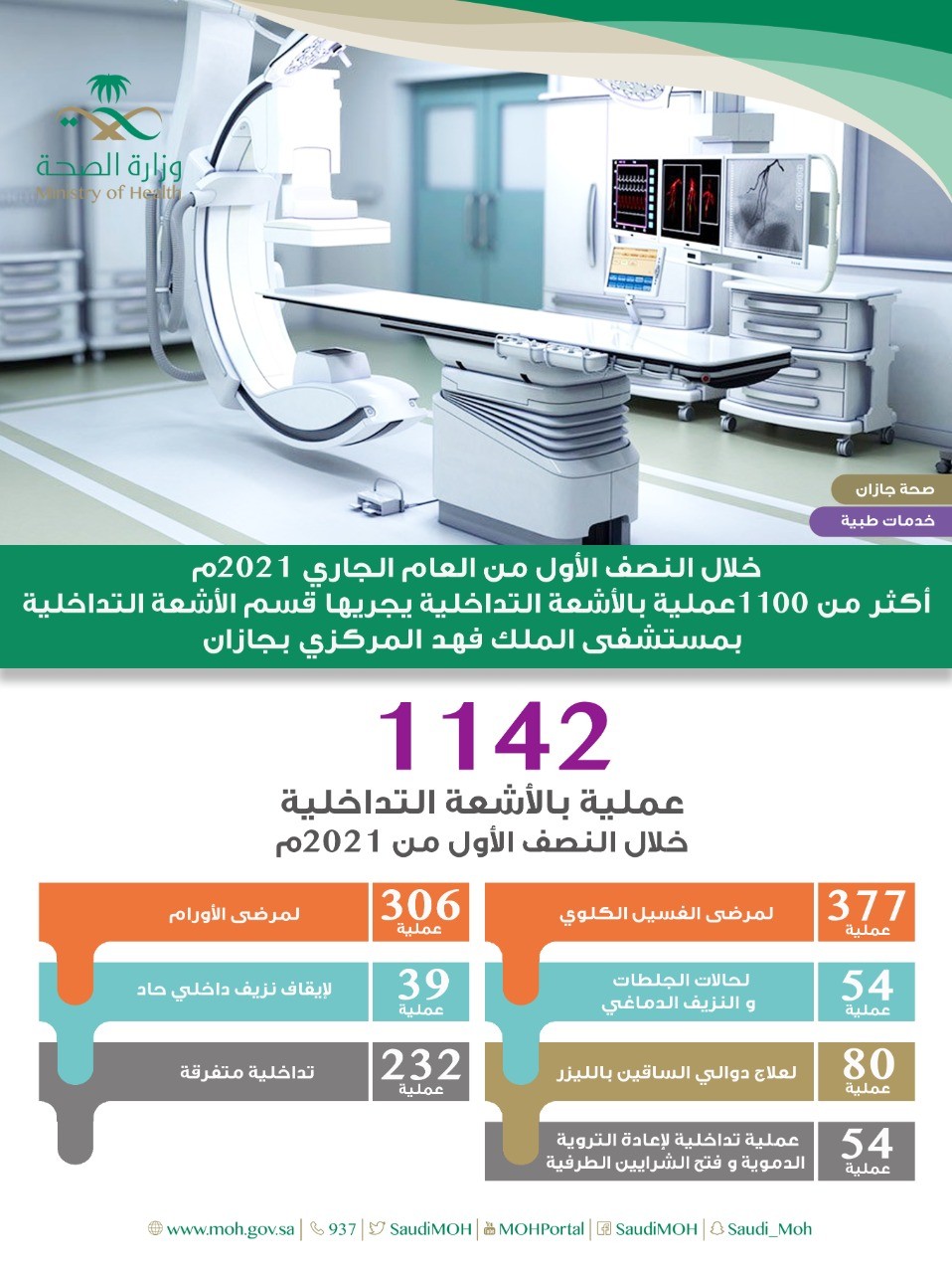 قالت الصحة في جازان بان قسم الأشعة التداخلية بمستشفى الملك فهد المركزي بجازان أجرى عدد " 1143 " عملية بالأشعة التداخلية خلال النصف الأول من العام 2021 م